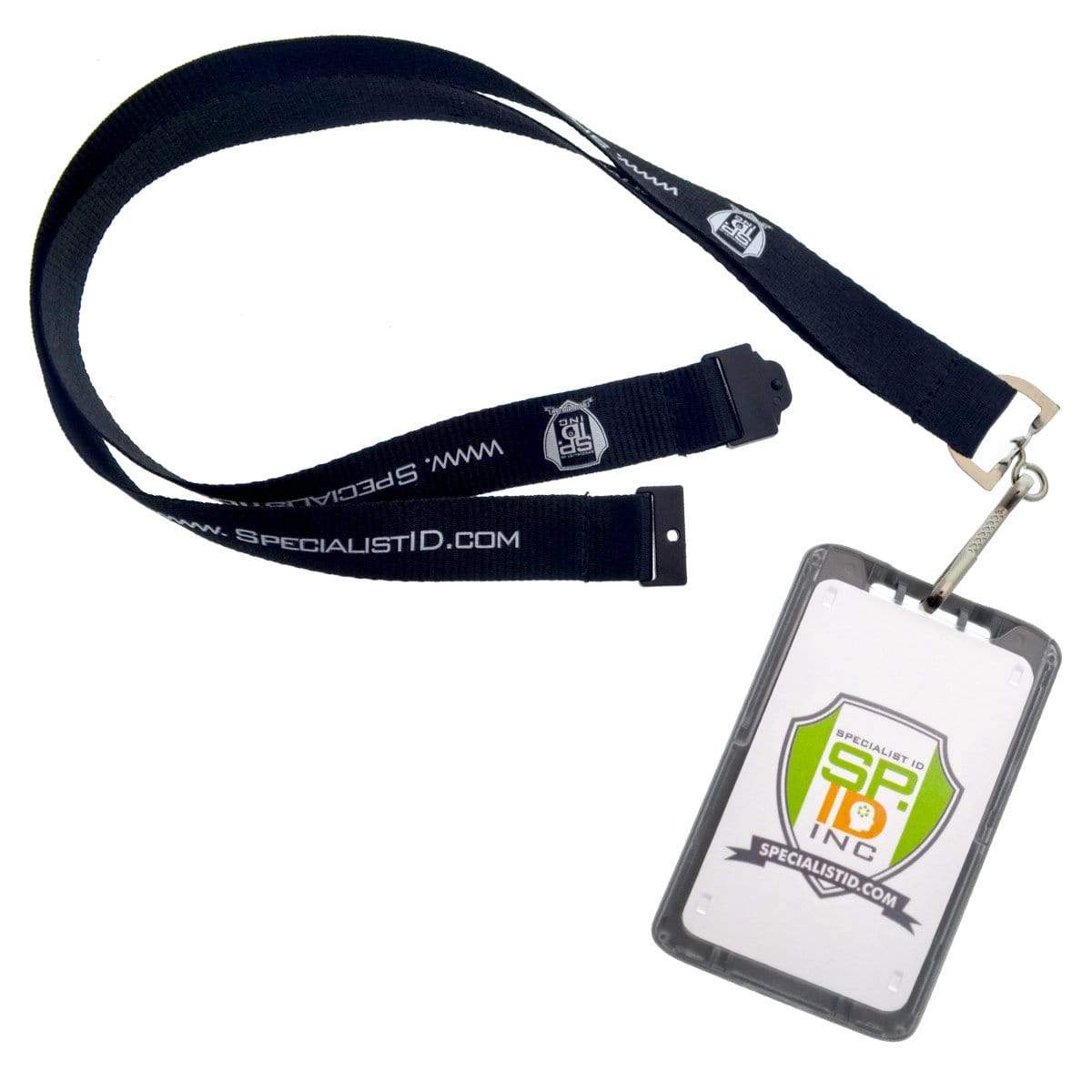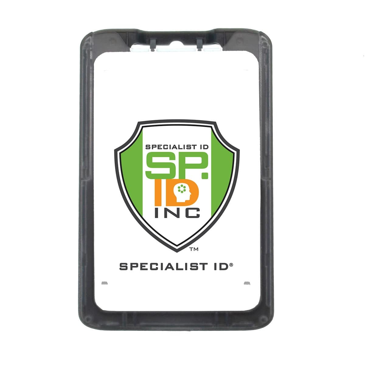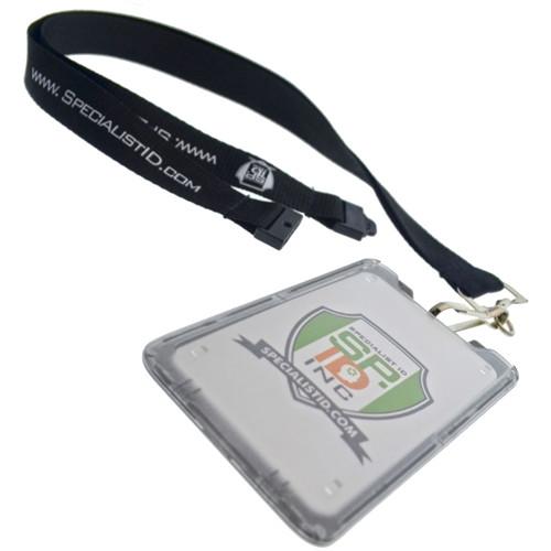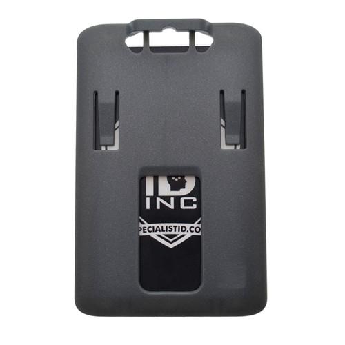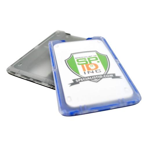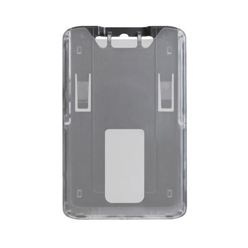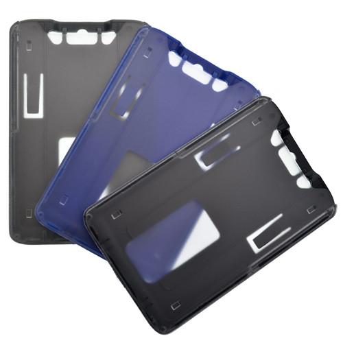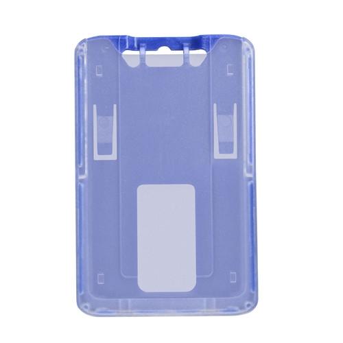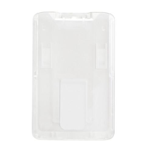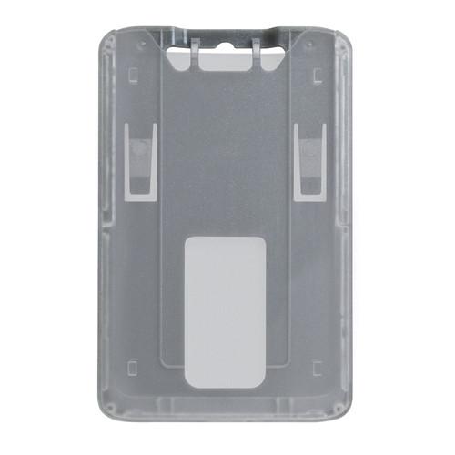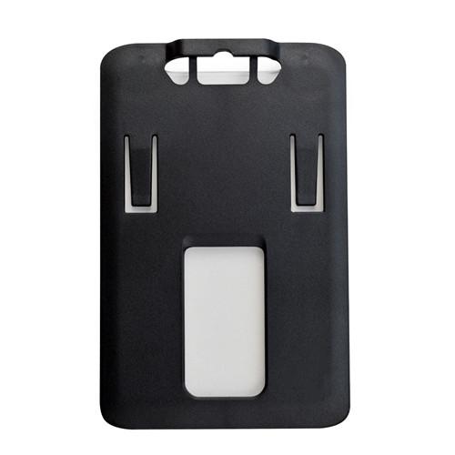 Our vertical B card holder, 1840-664X, is designed to securely lock your ID badge inside of this rigid holder. This badge holder has a open thumb slot on the back to easily remove your standard credit card sized ID.