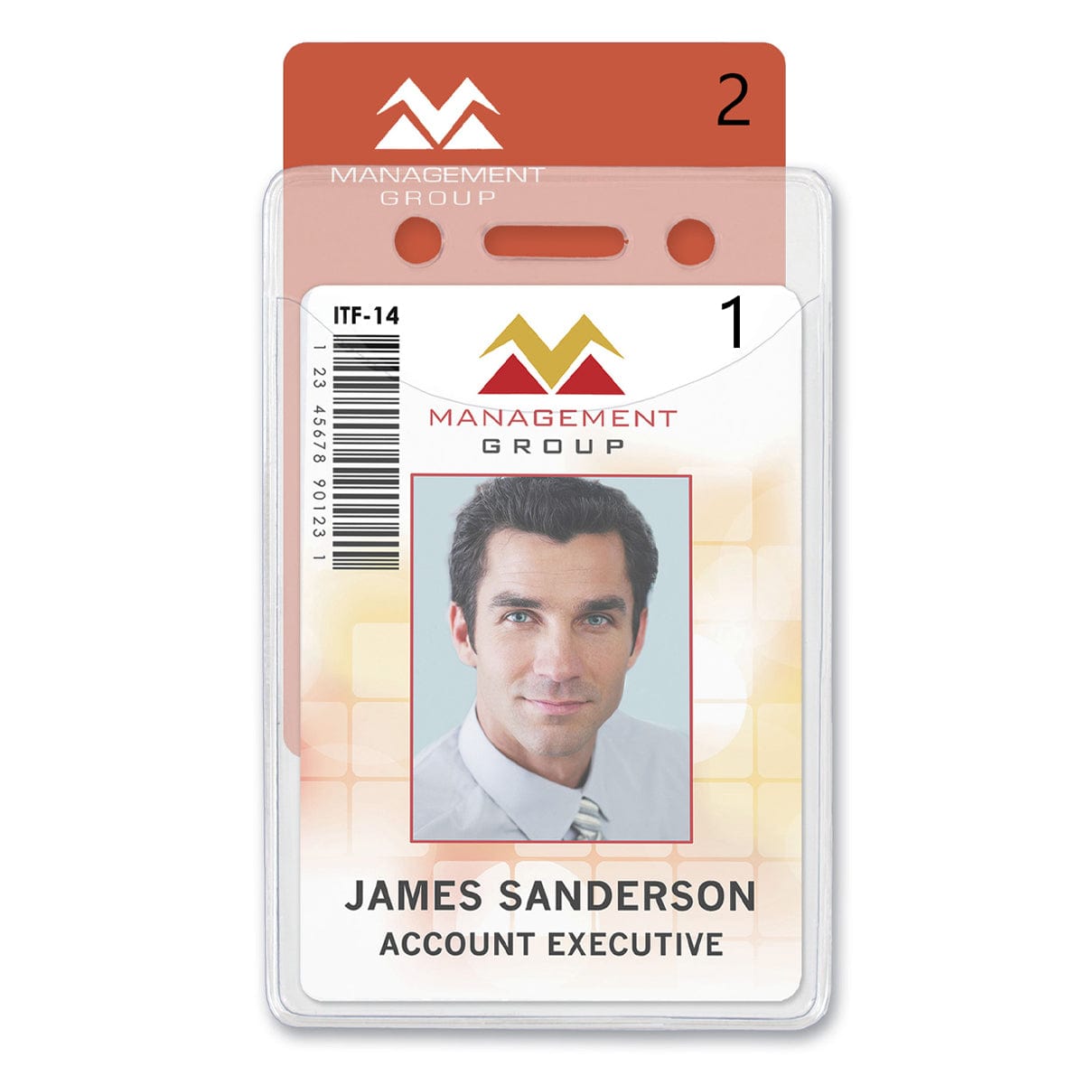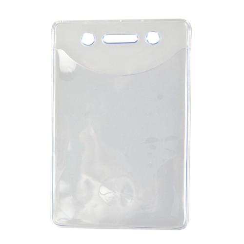 The premium clear vinyl vertical two pocket badge holder, part number 506-N2, fits any 2 3/8" X 3 3/8" ID badge, credential, ticket, bus or security pass. Simply slide your ID card inside it will display your badge vertically. The slot and chain holes on top of the badge holder let you easily attach your lanyard, badge reel, strap clip or neck chain; so you can keep your ID badge anywhere you'd like.