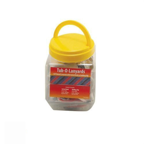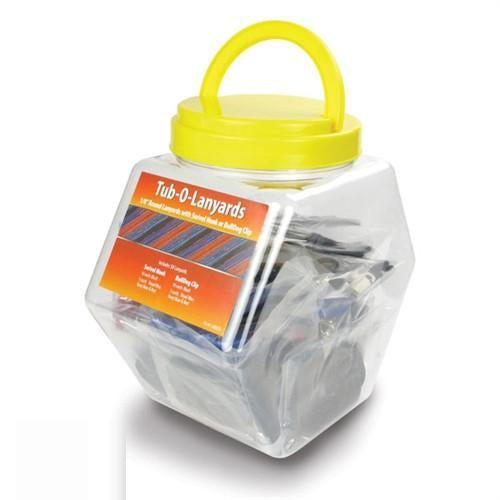 The Tub-O-Lanyards Contains 50 1/8" round lanyards in assorted colors. This container has a combination of round lanyards with swivel hook and bulldog clip. This fun new container is perfect to set at the front office, for all employees to pass by and pick up their favorite color lanyard.