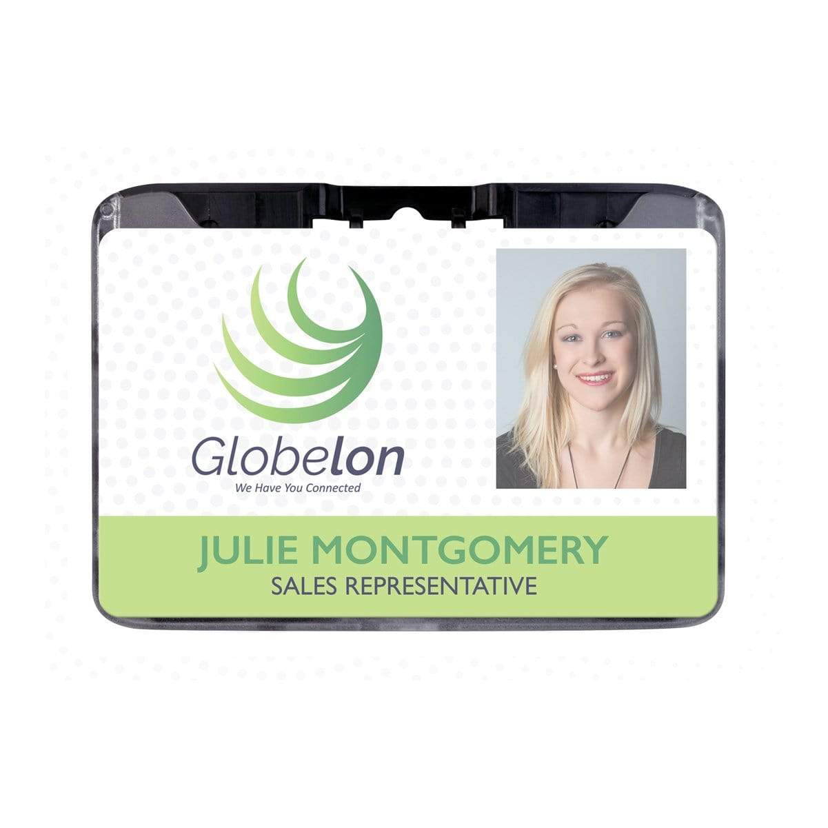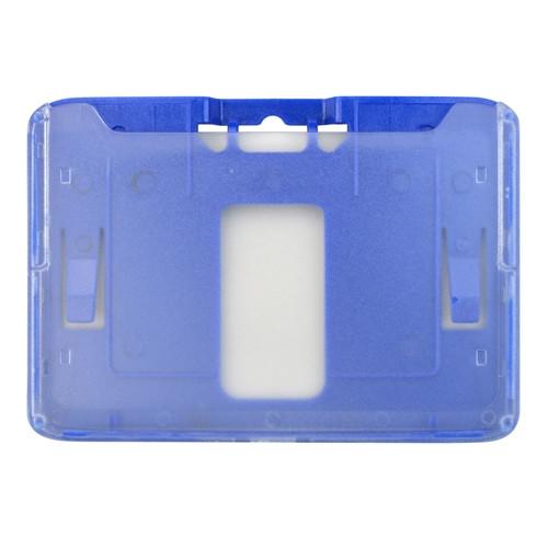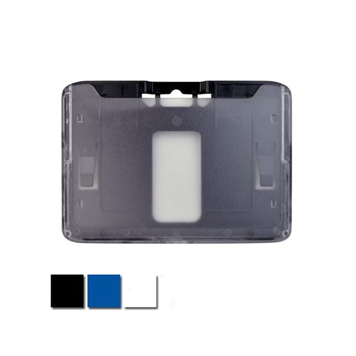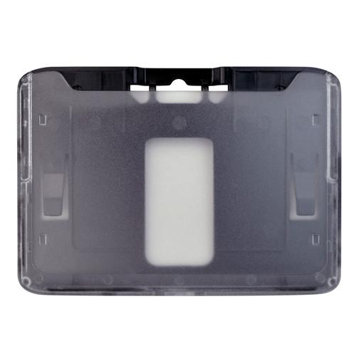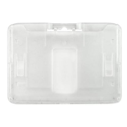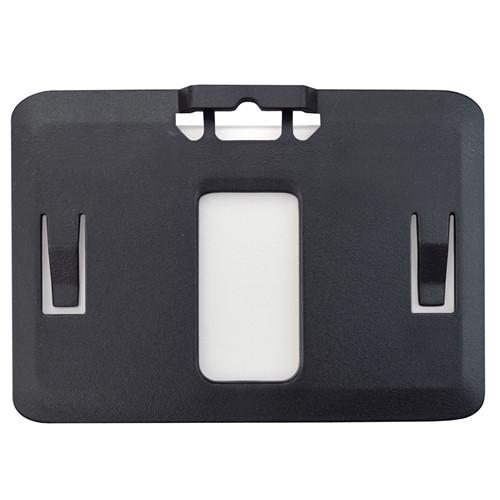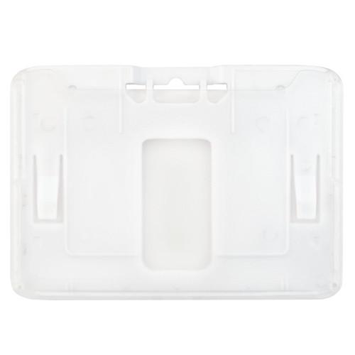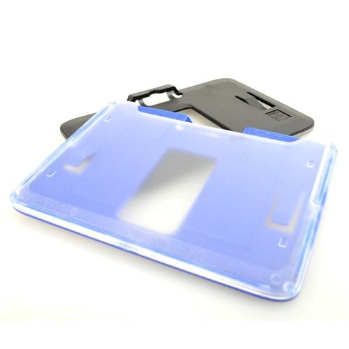 Our B card holder, 1840-665X, is designed to securely lock your ID badge inside of this rigid holder. This badge holder has a open thumb slot on the back to easily remove your standard credit card sized ID.