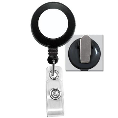 Black Round Badge Reel W/ White Sticker, Clear Vinyl Strap & Spring Clip. Reel Diameter 1-1/4" (32Mm). Sticker Diameter 3/4" ( 19Mm). Cord Length 34" (864Mm) - Rated For 100,000 Pulls.
