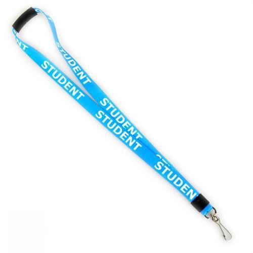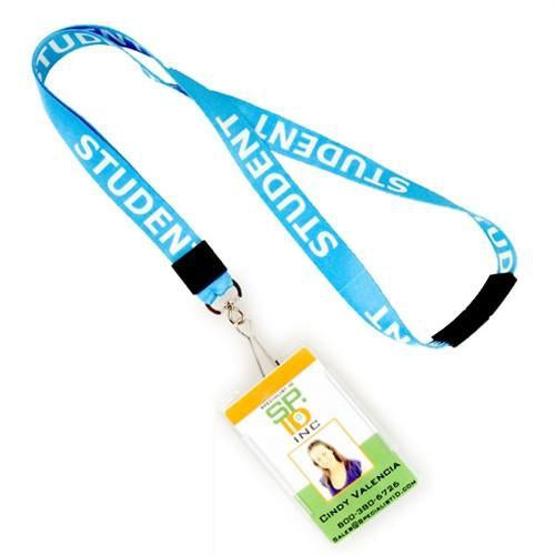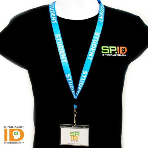 Student lanyard, part number SPID-2801, are silky 36" blue flat lanyards with bold white "STUDENT" text printed along the front and back. They're made exclusively, for quickly identifying Students with eye catching colors that stand out from the crowd. Our STUDENT printed lanyards come with a safety breakaway feature that allows them to snap apart if tugged or pulled, yet can be put back together afterwards for continued wear. Simply slide your ID credentials onto the nickel-plated steel hook and they'll hang around the chest area until the event is over.No Minimum Quantity to Order.