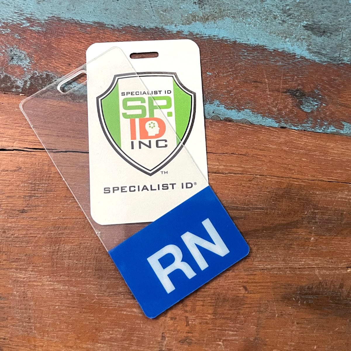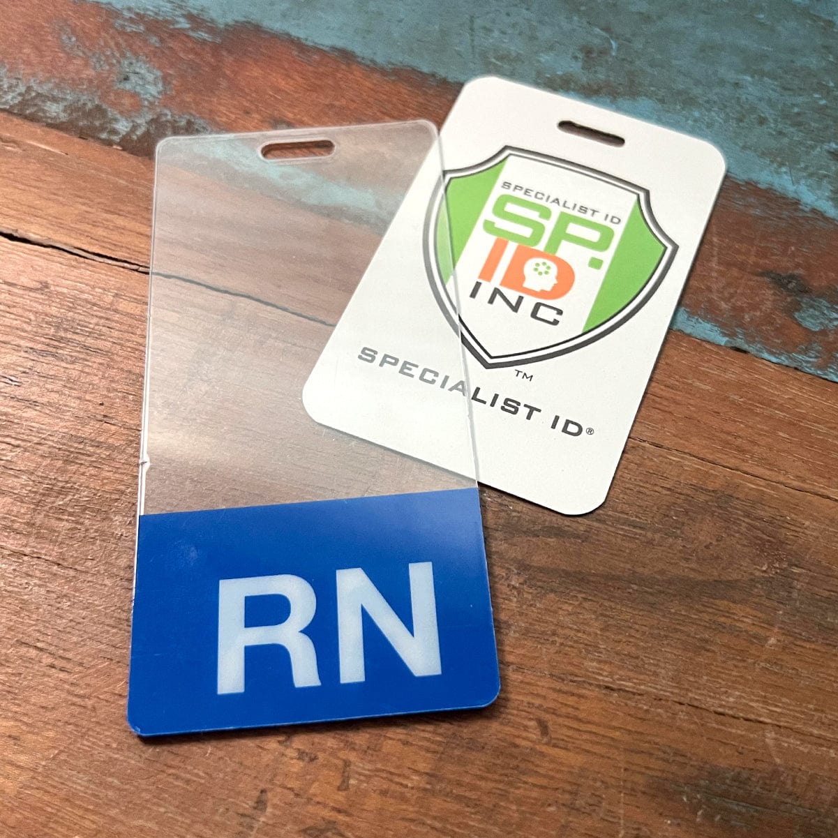 They are finally here! Our new clear vertical badge buddies.  Our "RN" vertical badge buddy with a color (Red or Blue) border provides instant role recognition for registered nurses.  This enhanced visibility helps patients, visitors, and colleagues quickly identify nurses in a healthcare setting, promoting safety and efficiency. The clear, transparent badge buddy, with RN printed on both sides, allows your standard size ID to be seen when it flips over. Slot hole ready to attach to your badge reel, strap clip or lanyard.