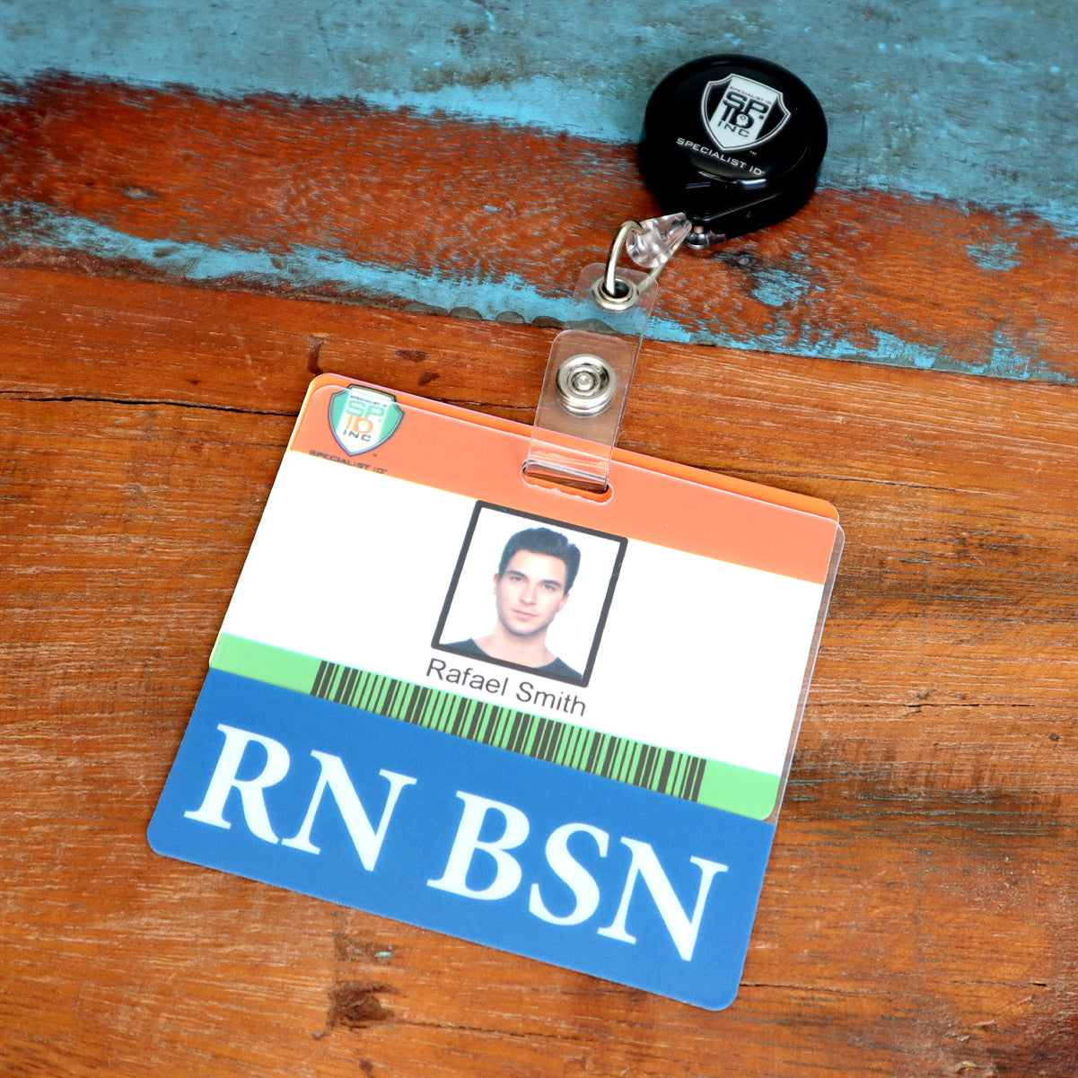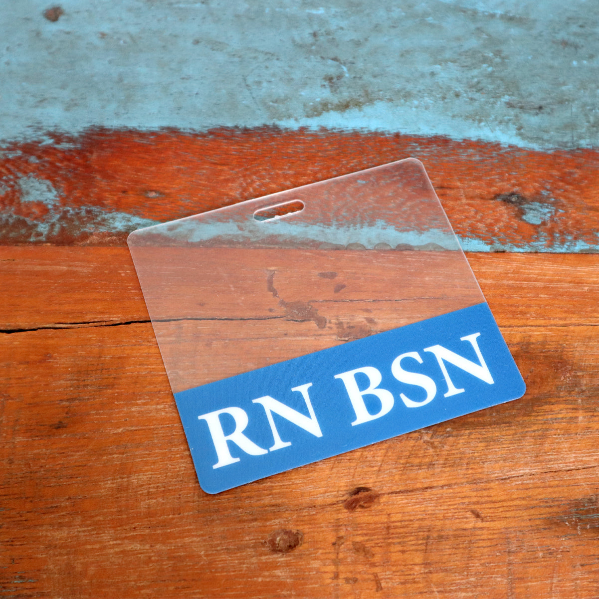 Our new clear "RN BSN" horizontal badge buddy with blue color border provides instant role recognition for registered nurses with a bachelor of science in nursing. This enhanced visibility helps patients, visitors, and colleagues quickly identify nurses in a healthcare setting, promoting safety and efficiency. The clear, transparent badge buddy, with RN BSN printed on both sides, allows your ID to be seen when it flips over. These are great for a busy hospital environment where faculty and patients can't afford to waste time closely examining each nurse's badge.