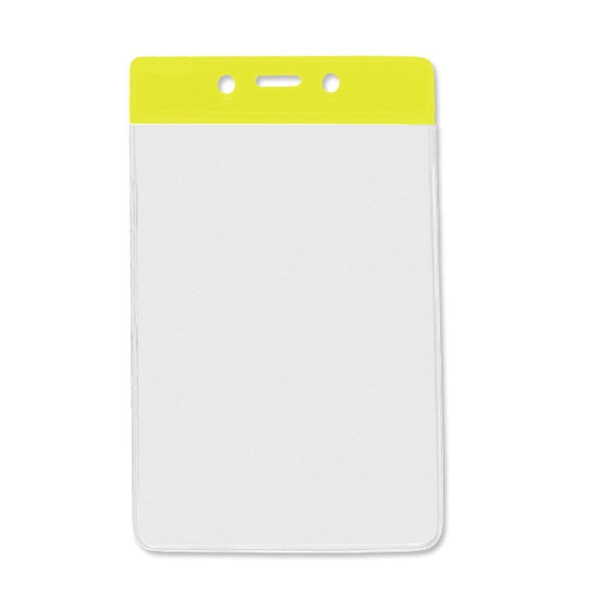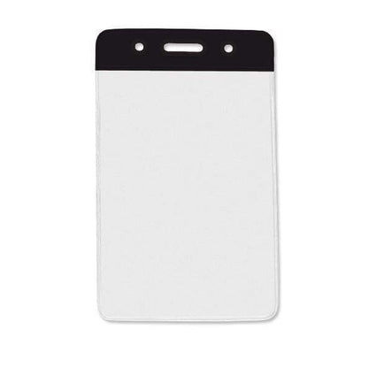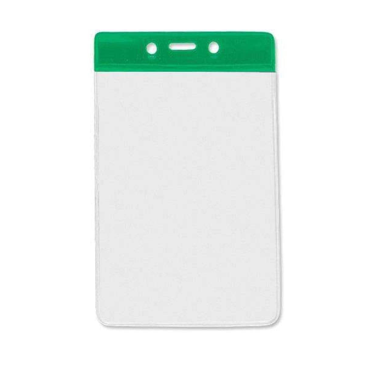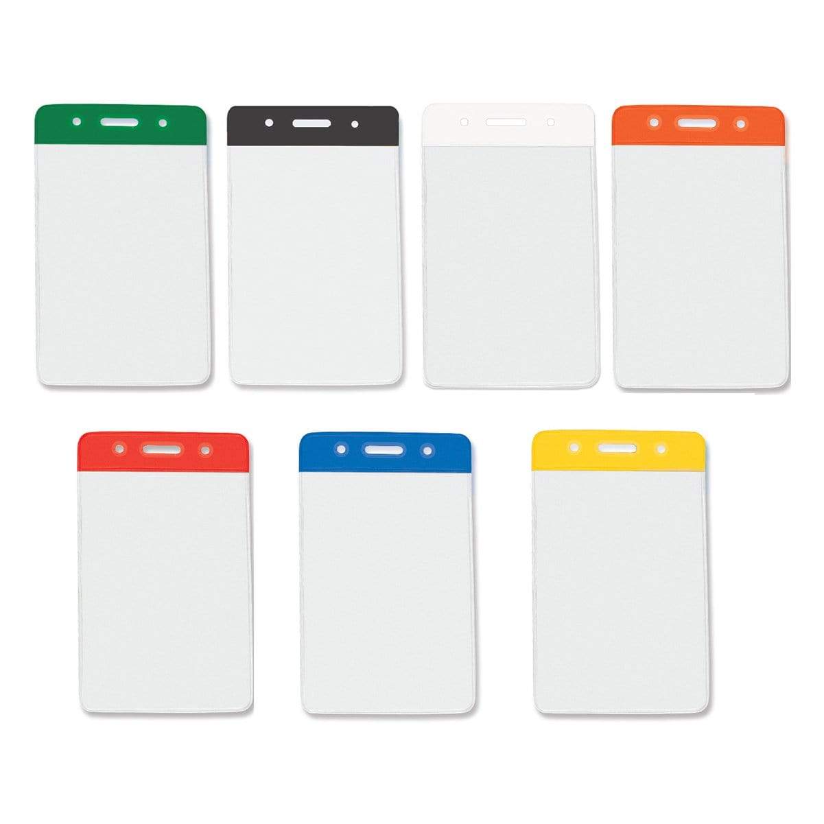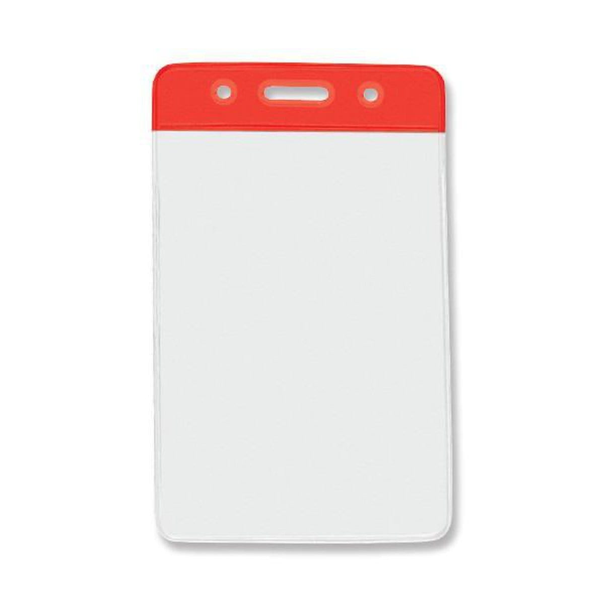 Color Coded vertical vinyl badge holders provides quick recognition of staff and associates in busy working environments. Load your credit card/drivers license sized ID card through the top of the holder, and it will vertically display your card in a clear vinyl holder that also protects your ID from dirt and grime. Afterwards, slide either a standard badge clip, neck chain, lanyard, or badge reel through the slot and chain holes on the color stripe for instant department, team, or clearance recognition.