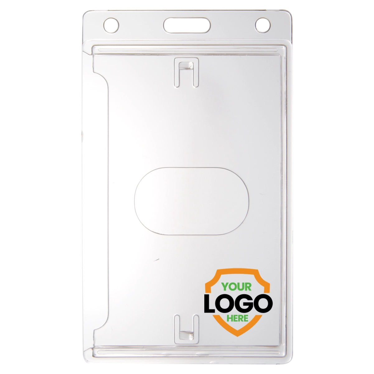 The custom crystal clear vertical, hard plastic card holder (726-CSN) is a sleek and transparent accessory designed to securely hold and display your identification cards, keycards, or any other important cards. Display your logo on the crystal clear surface, creating a powerful and eye-catching promotional item. Whether it's for corporate gifting, networking events, or enhancing your professional image, your full-color logo customization option ensures that your brand is showcased in the most captivating and memorable way possible, leaving a lasting impact on your clients and partners.