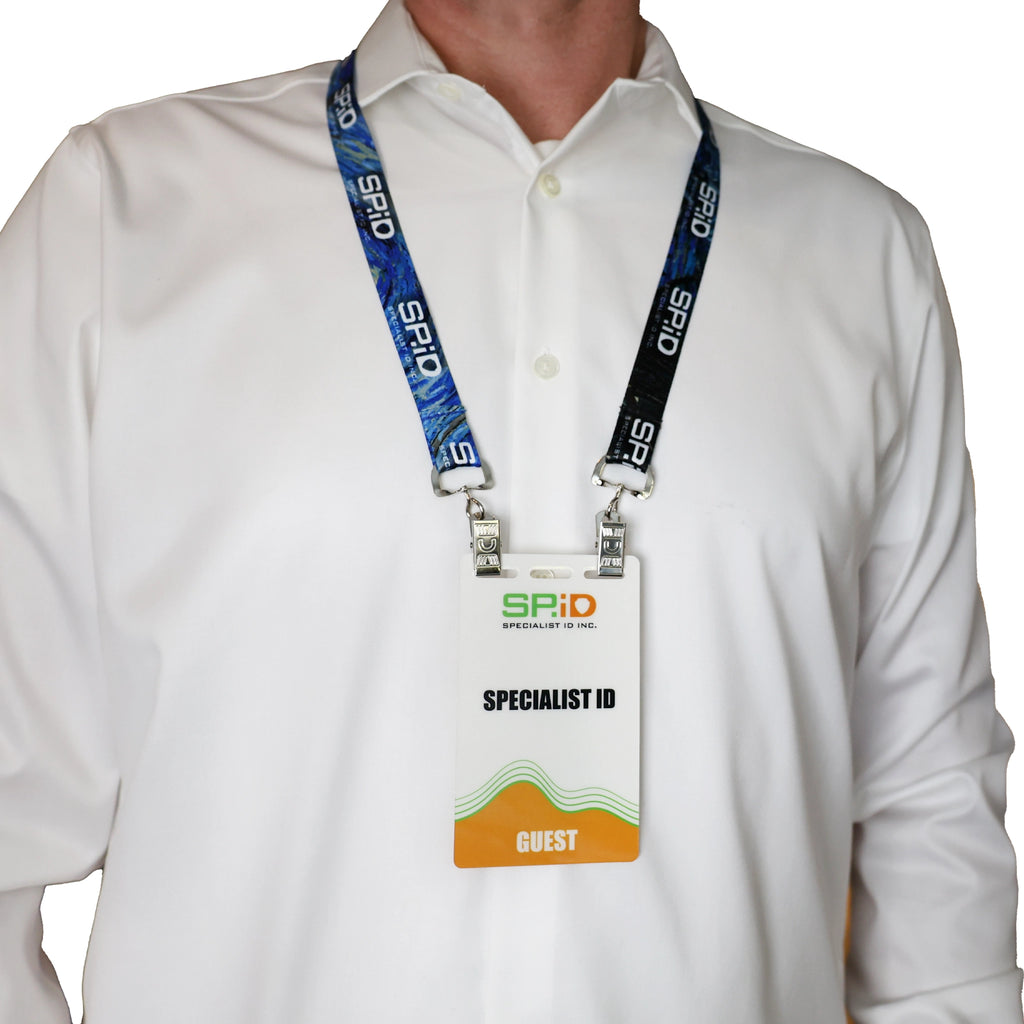 - Each end of the fabric ends with a separate metal fastener. Use this for larger badges and cards, or if you’re using the lanyard to suspend something wide.