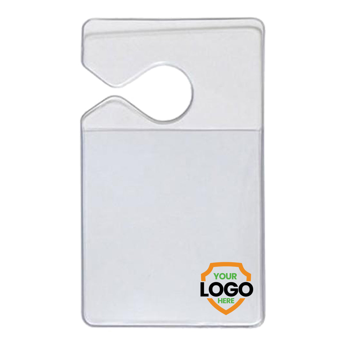 • Custom Clear Rigid Vinyl Vertical Vehicle Parking Pass Hang Tag Holder - Add Your Logo with a notch at the top and a cutout for easy access, perfect for customizing vinyl parking passes or vehicle hang tag holders. Featuring a "Your Logo Here" placeholder at the bottom right corner to promote brand awareness.