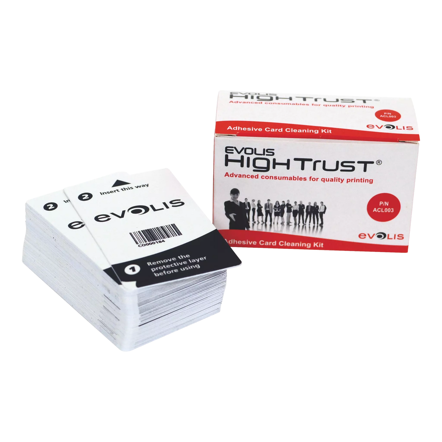 The Evolis ACL003 Adhesive Cleaning Cards are an essential tool for maintaining the longevity and picture quality of Evolis brand ID Card Printers. Included in this pack are fifty adhesive cleaning cards. To use the adhesive cards, double click the power button and insert the card with the sticky side up into the card feeder. This process will last twenty seconds and remove all dust and debris from the internal components. It is recommended that users clean the printer every time the ribbon is replaced or 1000 cards are printed. The warranty is voided if the printer is not properly cleaned each time 1200 cards have been printed.