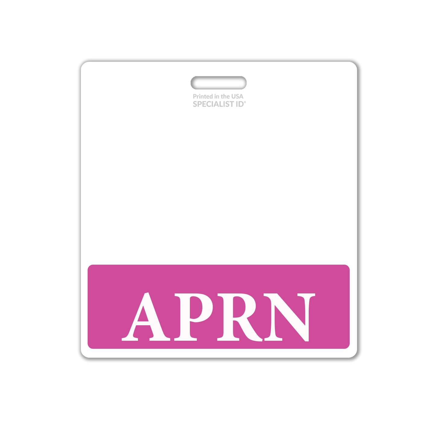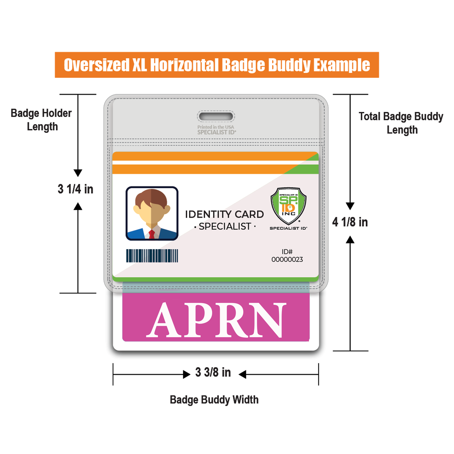 Our oversized "APRN" horizontal hospital ID badge buddy is 1" inch longer than our standard size badge buddies. Ideal to be worn beneath any standard (credit card sized) Healthcare ID badge worn inside a badge holder. Typically, for badges that do not have a slot punched hole.
