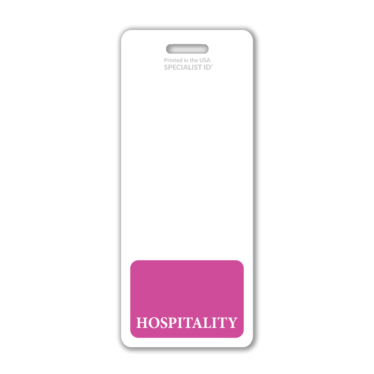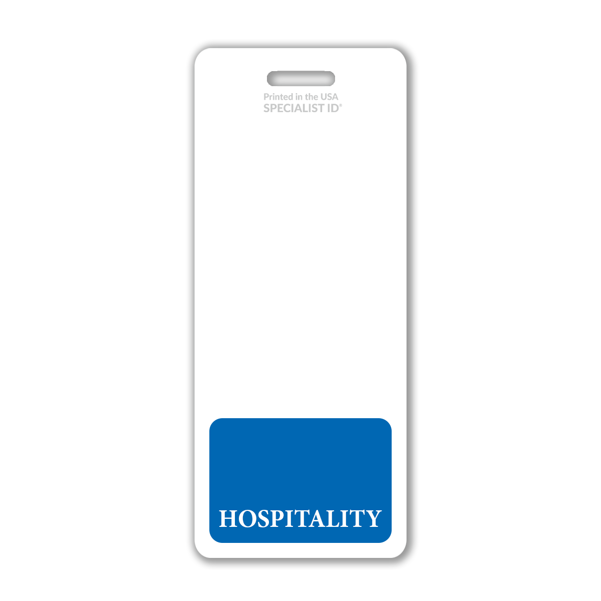 Our oversized "Hospitality" vertical ID badge buddy is 1 inch longer than our standard-size badge buddies. It is designed to fit perfectly beneath any standard (credit card-sized) ID badge worn in a badge holder, especially for badges without a slot-punched hole.