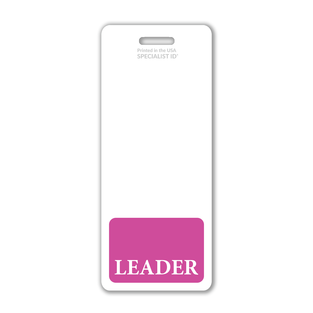 The Leader Badge Buddy is a vital identification tool for healthcare and professional environments, designed to ensure swift and clear recognition of team leaders by staff, patients, and visitors. Featuring the "Leader" title prominently displayed on both sides, it is framed with a vibrant color border for maximum visibility in busy settings. Constructed for durability and practicality, this badge buddy is flexible to resist wear and tear and easy to clean, aligning with the high standards of hygiene and professionalism required in leadership roles. Equipped with a slot punch hole, it attaches effortlessly to a badge reel or strap clip, making it easy to wear behind a standard vertical ID badge. This durable, laminated badge buddy enhances the visibility of leaders, reinforcing their position and fostering confidence among teams. By clearly identifying the wearer’s role, it supports trust, collaboration, and efficiency within the workplace.