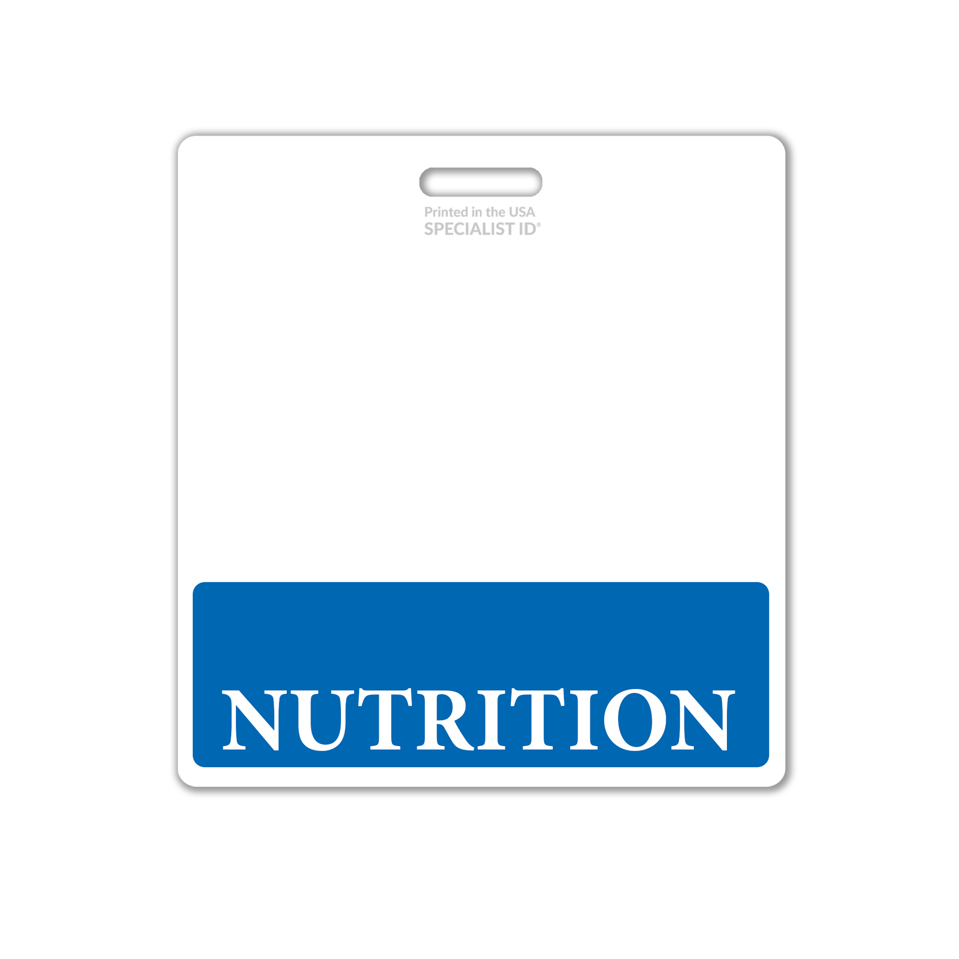 The Nutrition Badge Buddy is an essential identification tool for healthcare and dietary environments, designed to ensure quick and clear recognition of nutrition staff by patients, visitors, and colleagues. Featuring the "Nutrition" title prominently displayed on both sides, it is framed with a vibrant color border for easy visibility in busy settings. Built for durability and practicality, this badge buddy is flexible to resist breakage and features an easy-to-clean surface, meeting the high hygiene standards required in medical and food service environments. With a slot punch hole for effortless attachment to a badge reel or strap clip, it is designed to be worn securely behind a standard horizontal ID badge. This laminated, high-quality badge buddy enhances the visibility of nutrition staff while emphasizing their vital role in promoting health and well-being. It fosters trust and professionalism by clearly identifying the wearer’s expertise and responsibilities.