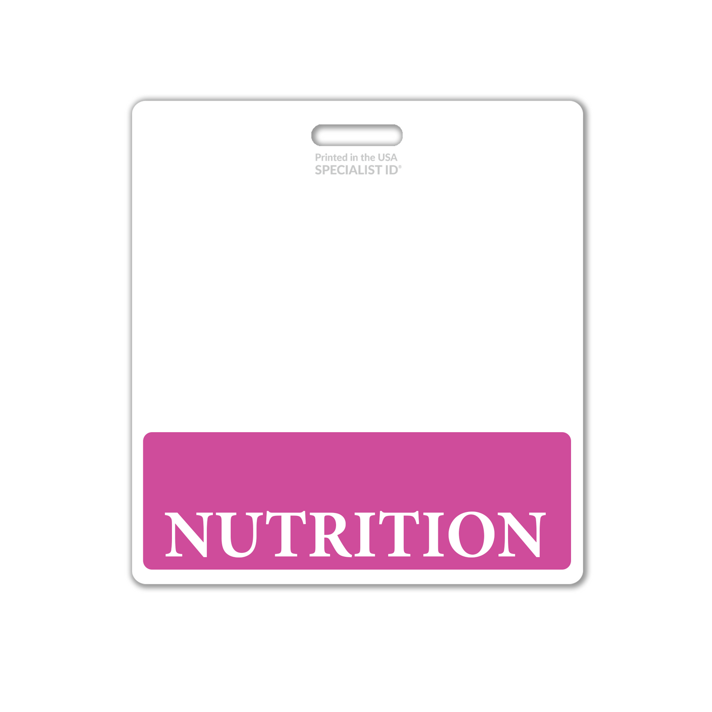 Our oversized "Nutrition" horizontal hospital ID badge buddy is 1 inch longer than our standard-size badge buddies. It is designed to fit neatly beneath any standard (credit card-sized) ID badge worn in a badge holder, particularly for badges that do not include a slot-punched hole.