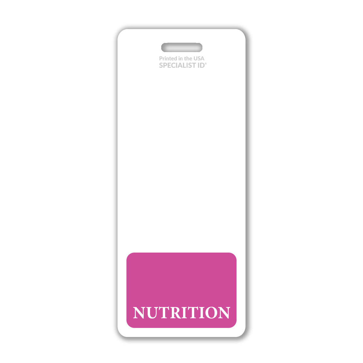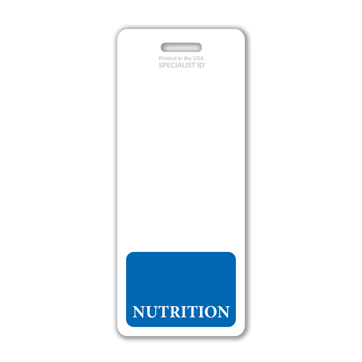 Our oversized "Nutrition" vertical hospital ID badge buddy is 1 inch longer than our standard-size badge buddies. It is designed to fit neatly beneath any standard (credit card-sized) ID badge worn in a badge holder, particularly for badges that do not include a slot-punched hole.