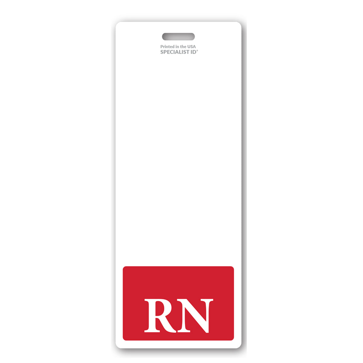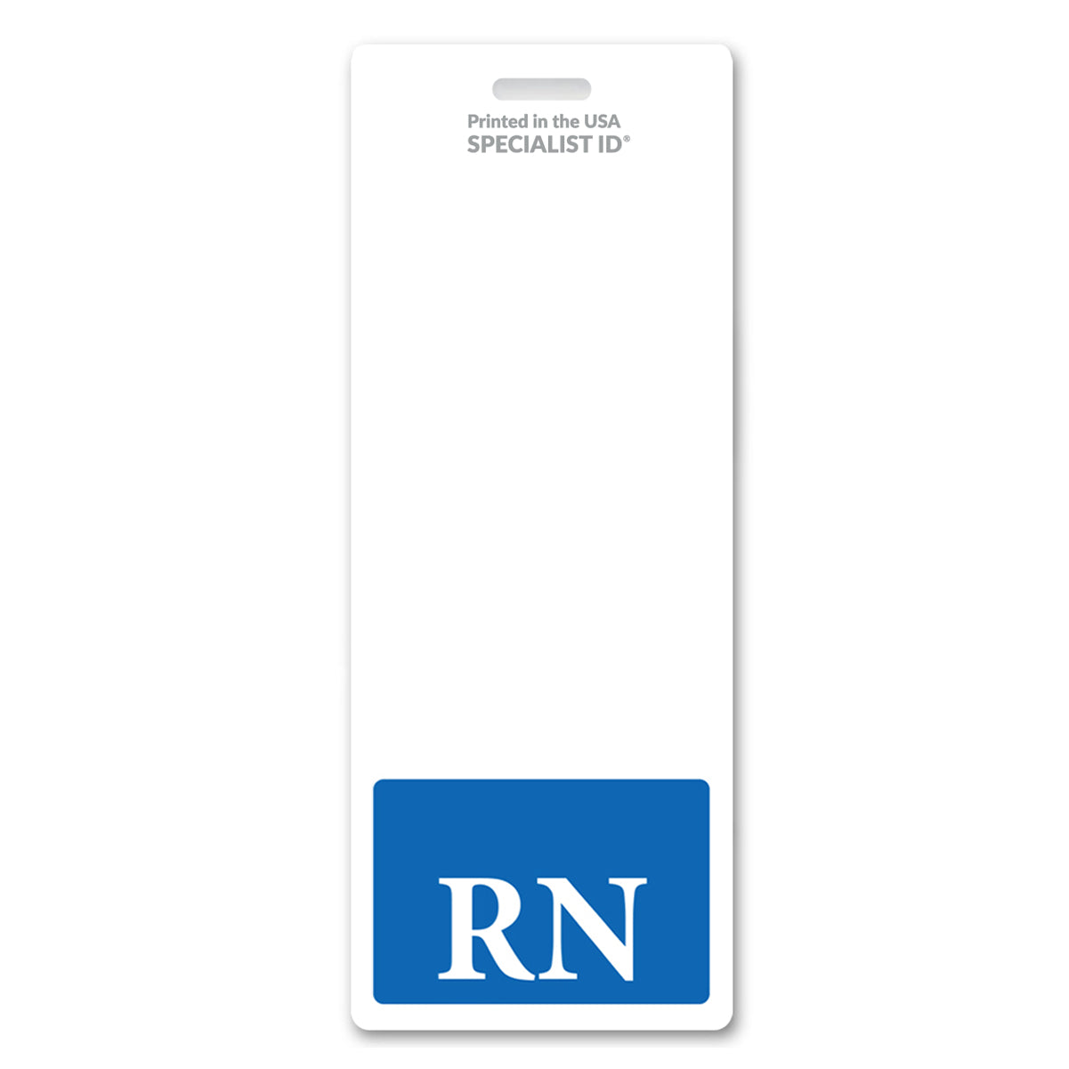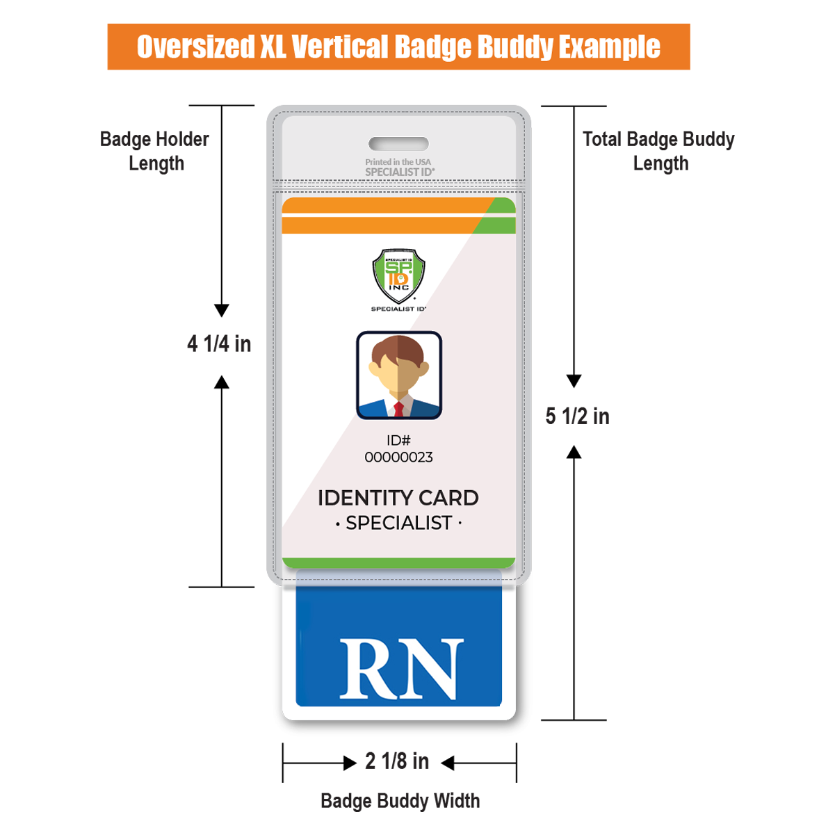 Our oversized "RN" registered nurse vertical hospital ID badge buddy is 1" inch longer than our standard size badge buddies. Ideal to be worn beneath any standard (credit card sized) nurse ID badge that is worn inside a badge holder. Typically, for badges that do not have a slot punched hole.