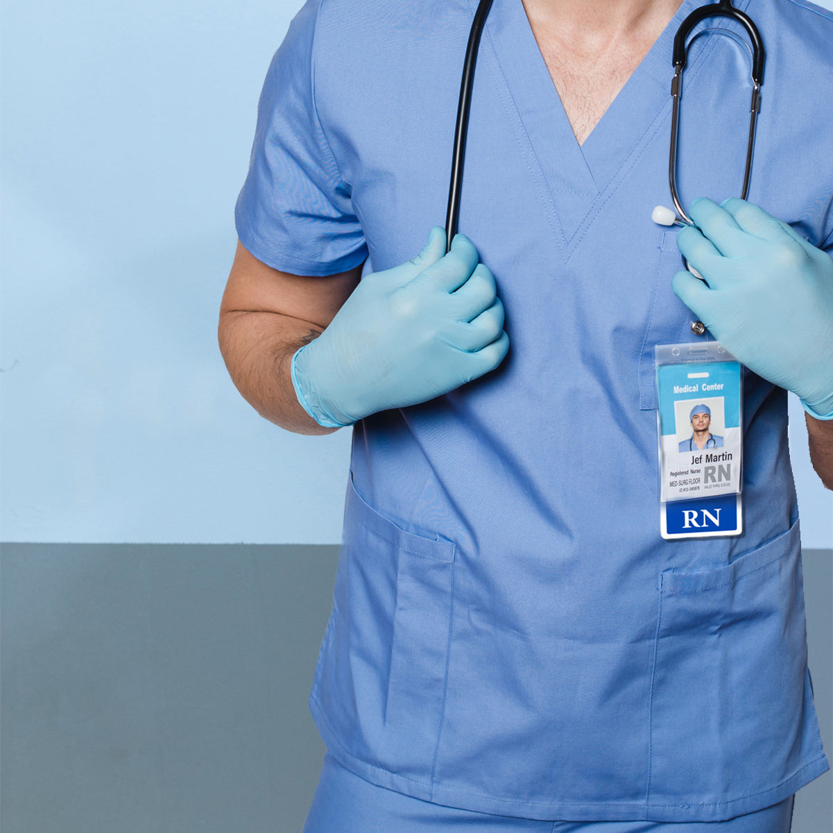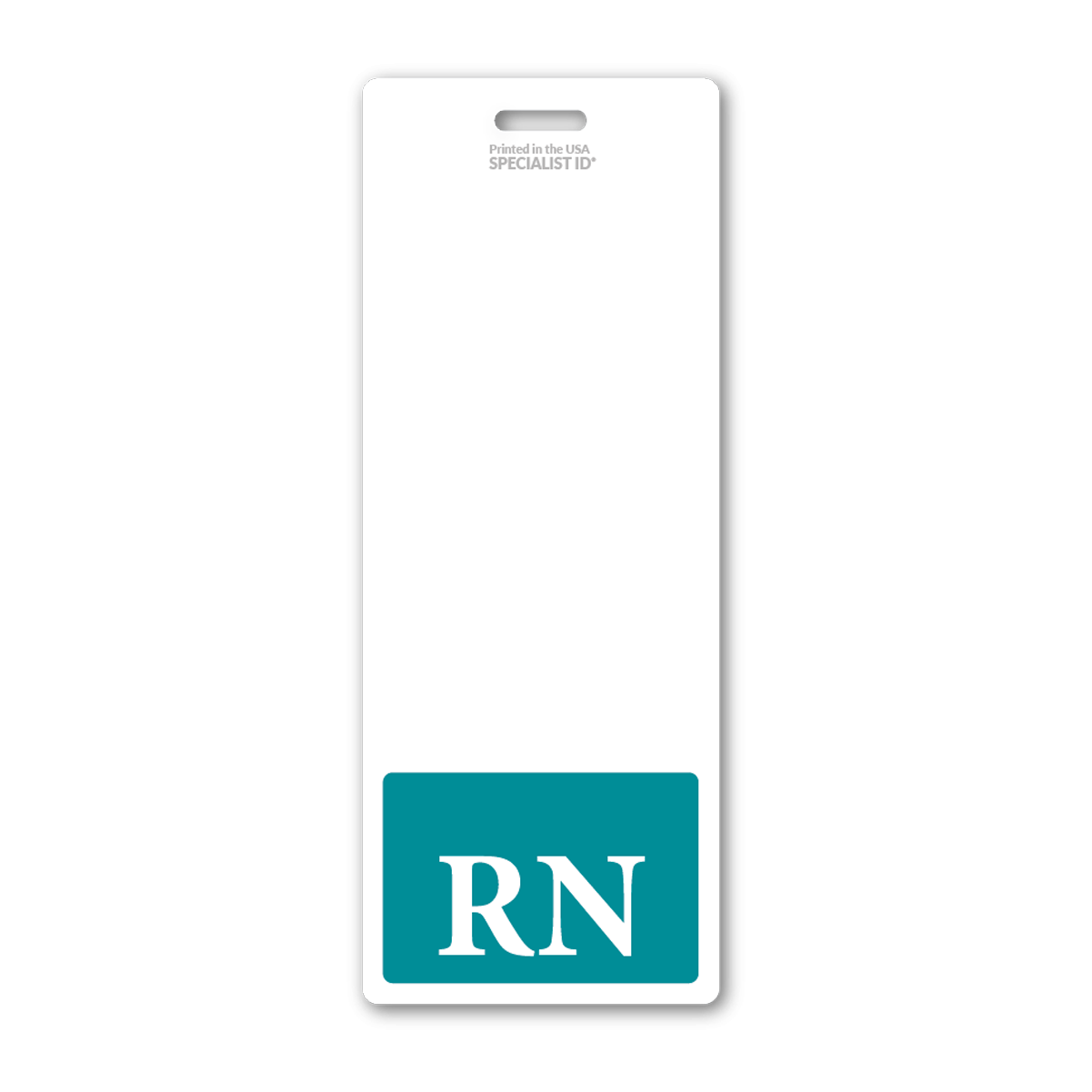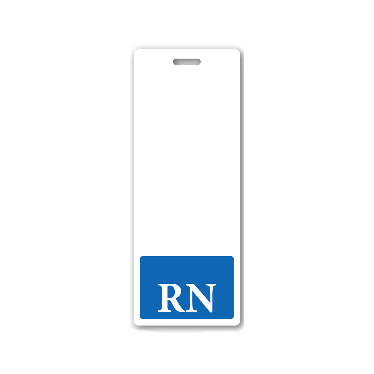 Our oversized "RN" registered nurse vertical hospital ID badge buddy is 1" inch longer than our standard size badge buddies. Ideal to be worn beneath any standard (credit card sized) nurse ID badge that is worn inside a badge holder. Typically, for badges that do not have a slot punched hole.