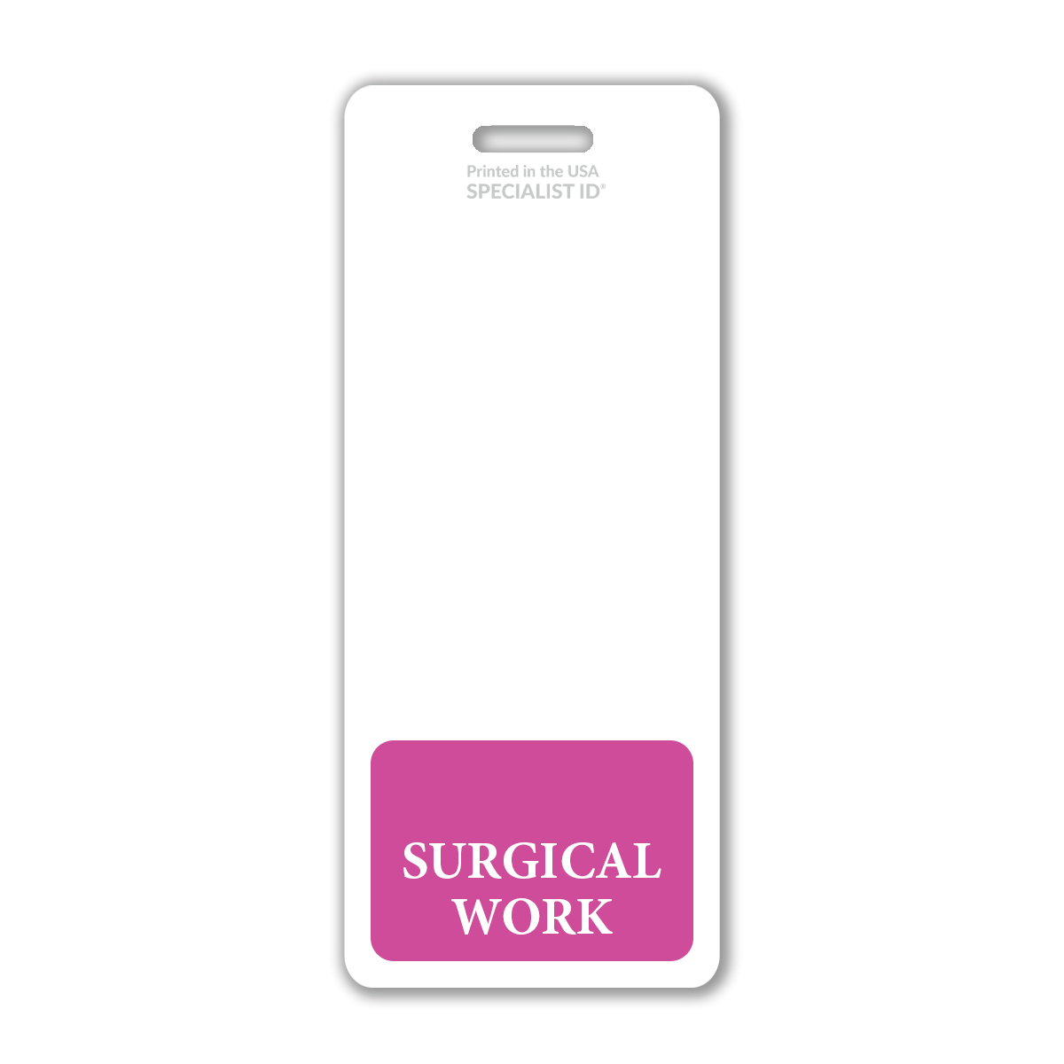 The Surgical Work Badge Buddy is an essential identification tool for healthcare settings, designed to ensure quick and clear recognition of surgical staff by patients, colleagues, and visitors. The "Surgical Work" title prominently displayed on both sides is framed with a vibrant color border for enhanced visibility in fast-paced and high-pressure environments. Built for durability and practicality, this badge buddy is flexible to resist breakage and features an easy-to-clean surface, meeting the stringent hygiene standards required in surgical roles. Equipped with a slot punch hole, it attaches effortlessly to a badge reel or strap clip, allowing it to be worn securely behind a standard vertical ID badge. This durable, laminated badge buddy highlights the vital role of surgical staff, fostering trust, professionalism, and collaboration in delivering exceptional care