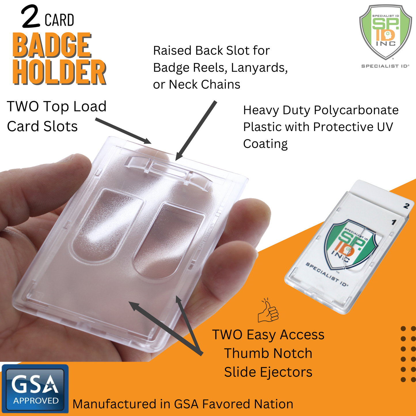 Our rigid 2 card holder securely holds up to two standard credit card sized ID badges. Independent thumb slots make it easy to slide out either card independently of each other for use.