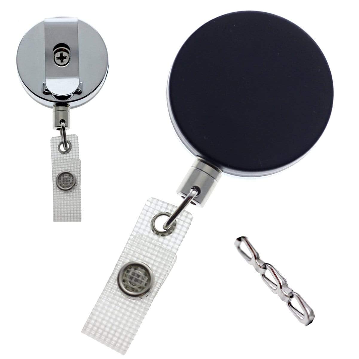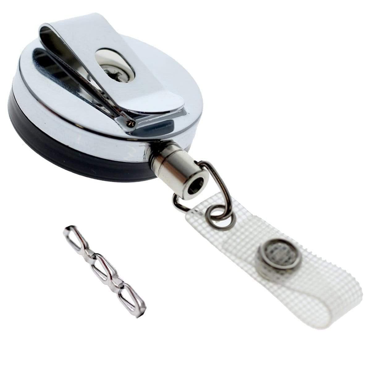 • Black /Chrome Heavy-Duty Badge Reel W/ Link Chain Reinforced Vinyl Strap & Belt Clip