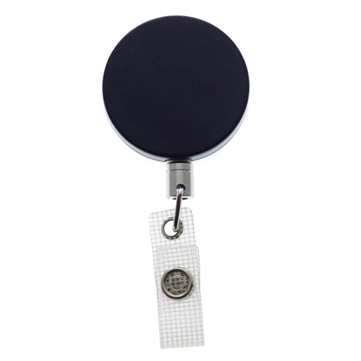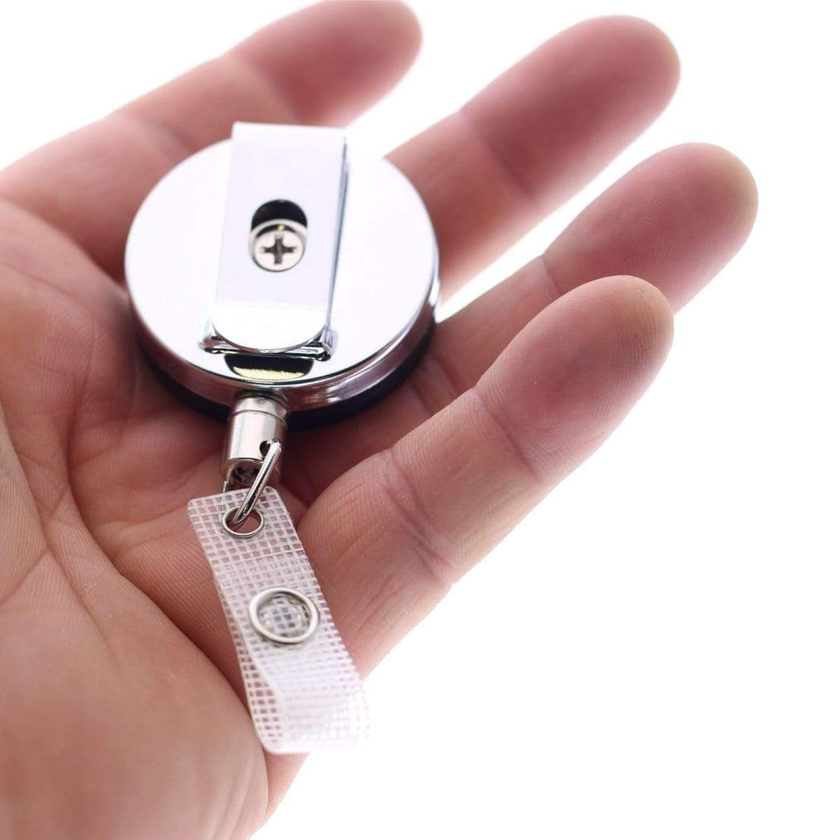This heavy duty badge reel has a chain instead of a nylon cord for extra strength. It also has a stronger spring which allows it to hold more weight than a economy badge reel. It has a sleek black finish on the front and a shiny chrome finish on the back. The standard belt clip allows you to attach this reel to your belt, pocket or bag strap. Rated for up to 10,000 pulls, this reel has a retractable chain that will extend up to 16" (588mm). The reel diameter is 1 1-2" (38mm) making it larger than a standard badge reel.