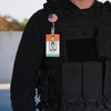 • A person wearing a black vest holds an identification card, attached to a Heavy Duty Custom Printed Badge Reel With Steel Cable 2120-3305 - Add Your Logo, showing a photo of "Rafael Smith" with the text "Operations" on it. The vest also has a round pin with the American flag.