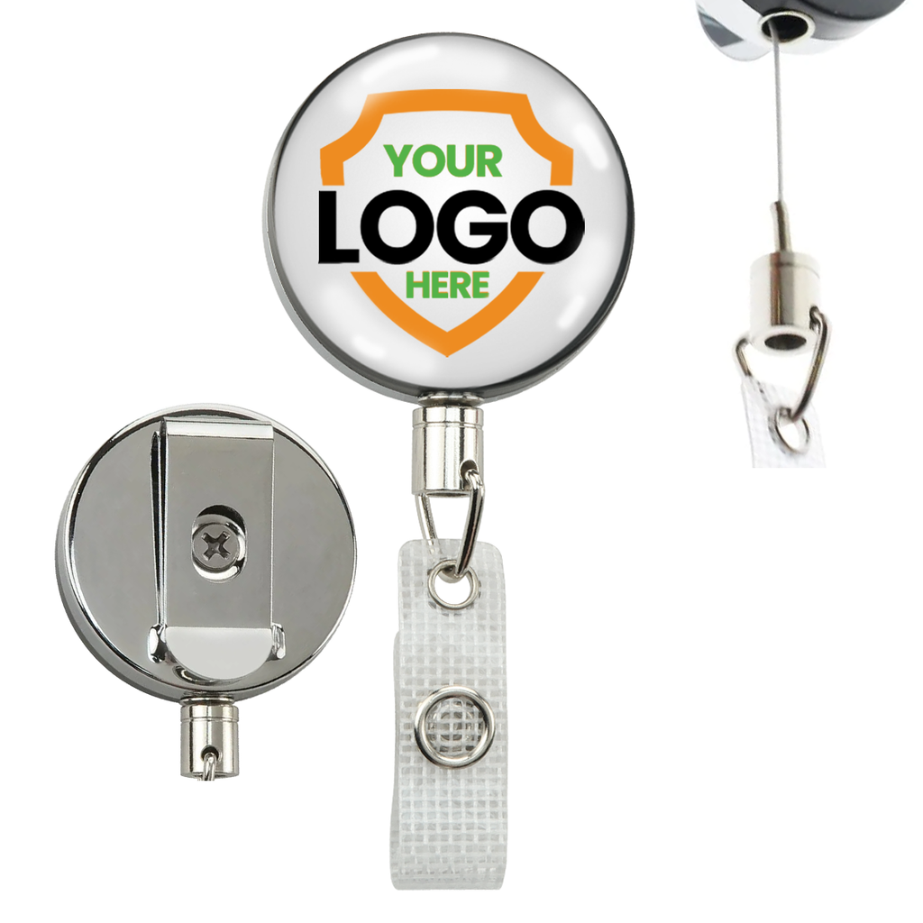 • Custom Printed Heavy Duty Retractable All Metal Badge Reels with 24" Steel Cable Cord
