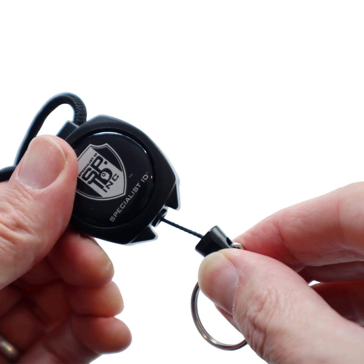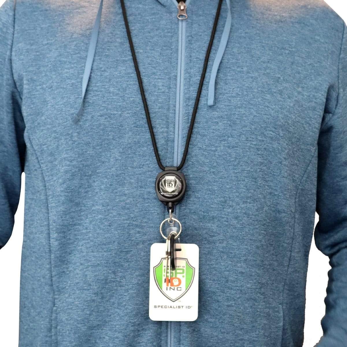 The retractable Sidekick badge reel has a thick Kevlar® cord and a "no twist" end notch to keep your credentials facing forward and prevent them from spinning when retracting or releasing, while sturdily hanging from your breakaway paracord lanyard.