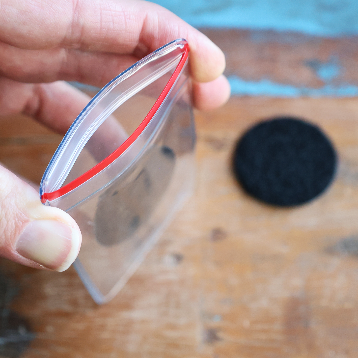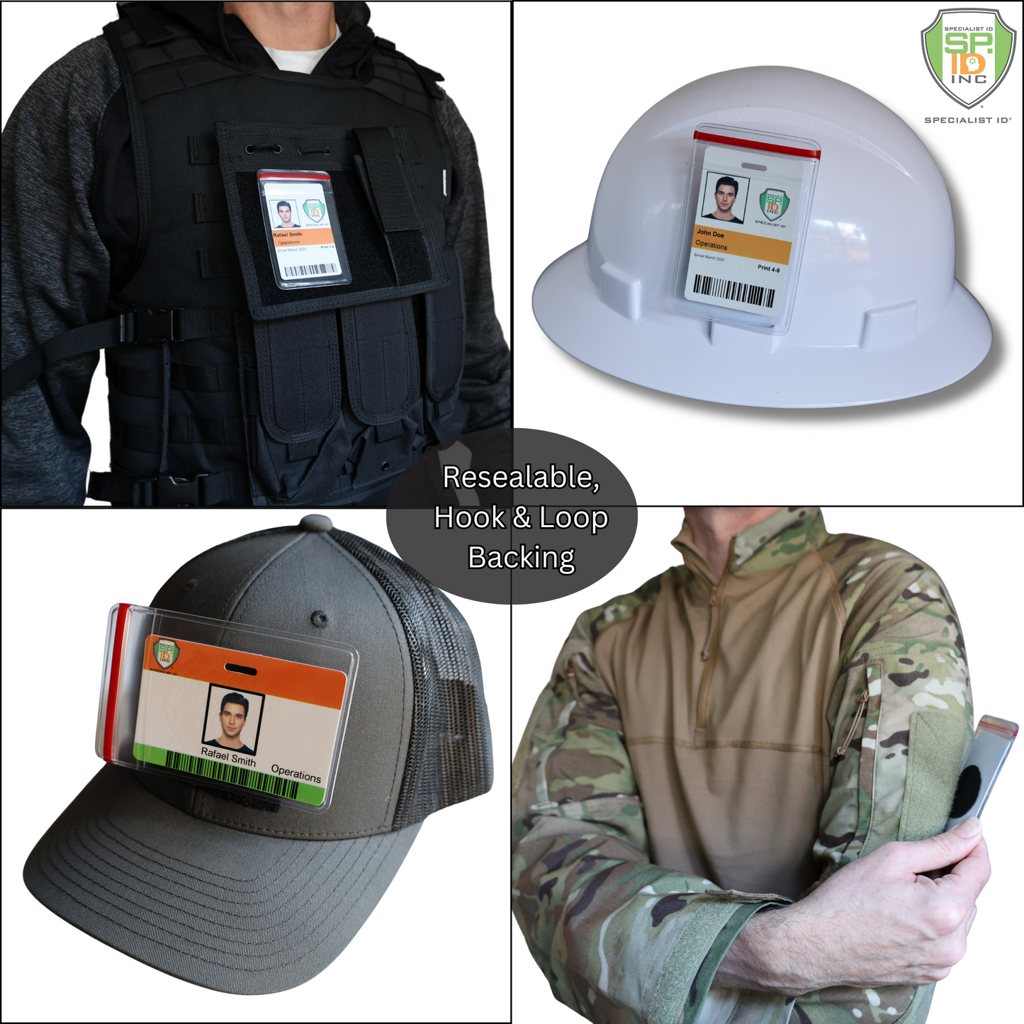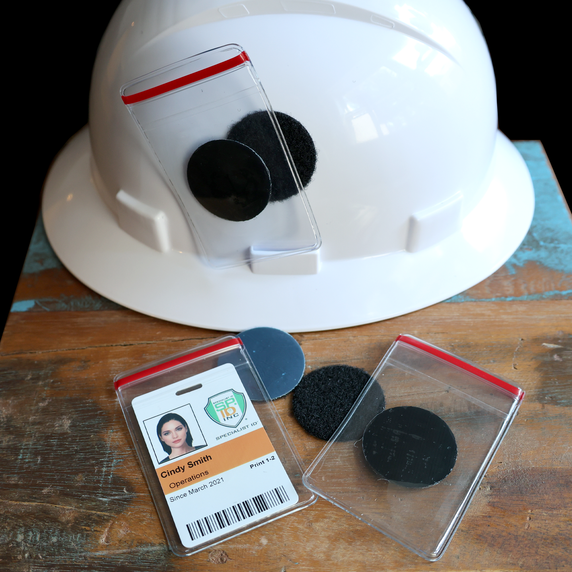 This heavy duty vinyl badge holder has an adhesive backing and a resealable top. Water-resistant with a red zipper top to keep out dirt and moisture. Slip your vertical credit card sized ID in from the top and seal the zip top to protect your ID badge. Great for construction sites - Stick to hard hats, vests, gear, or shelving units - no clips or lanyards needed.