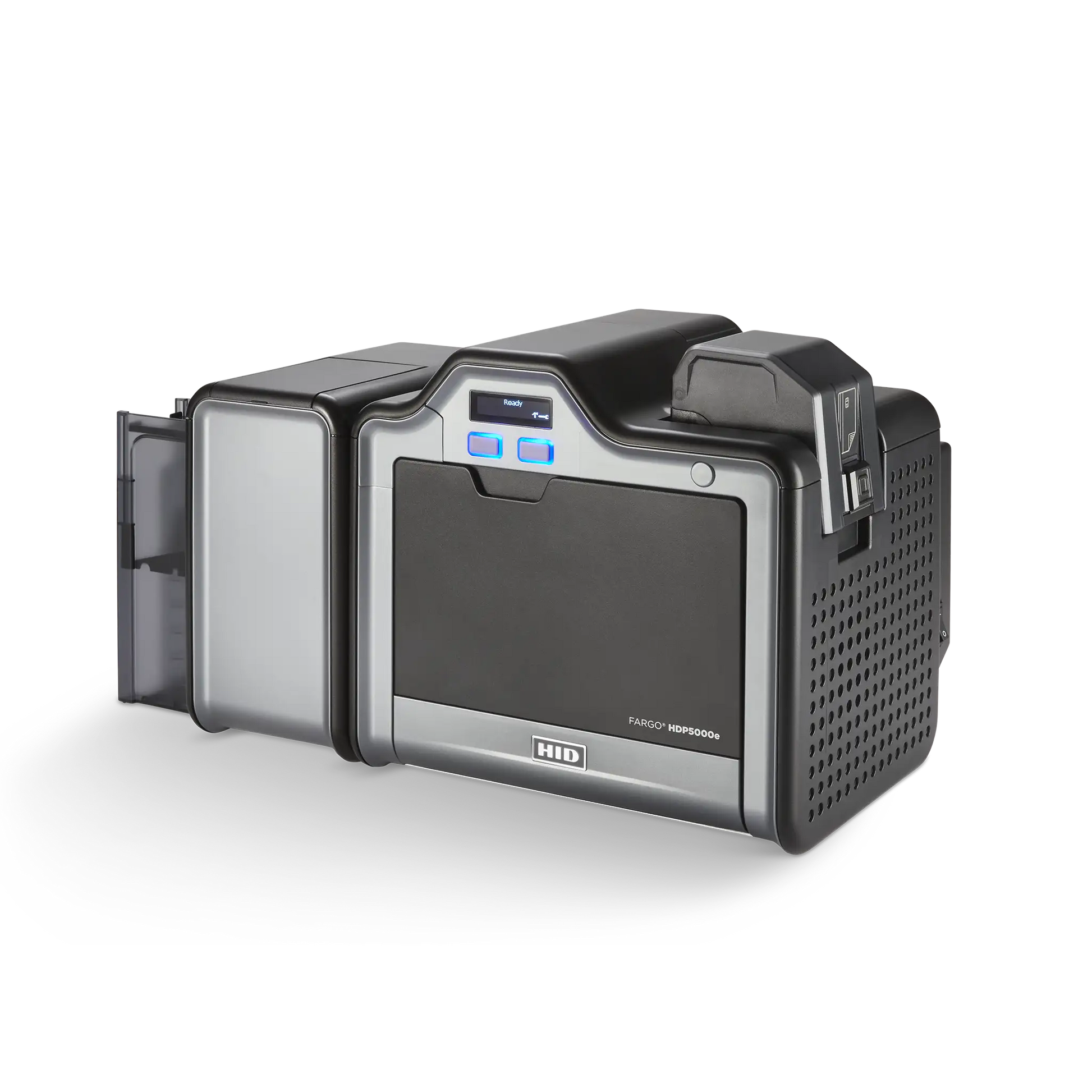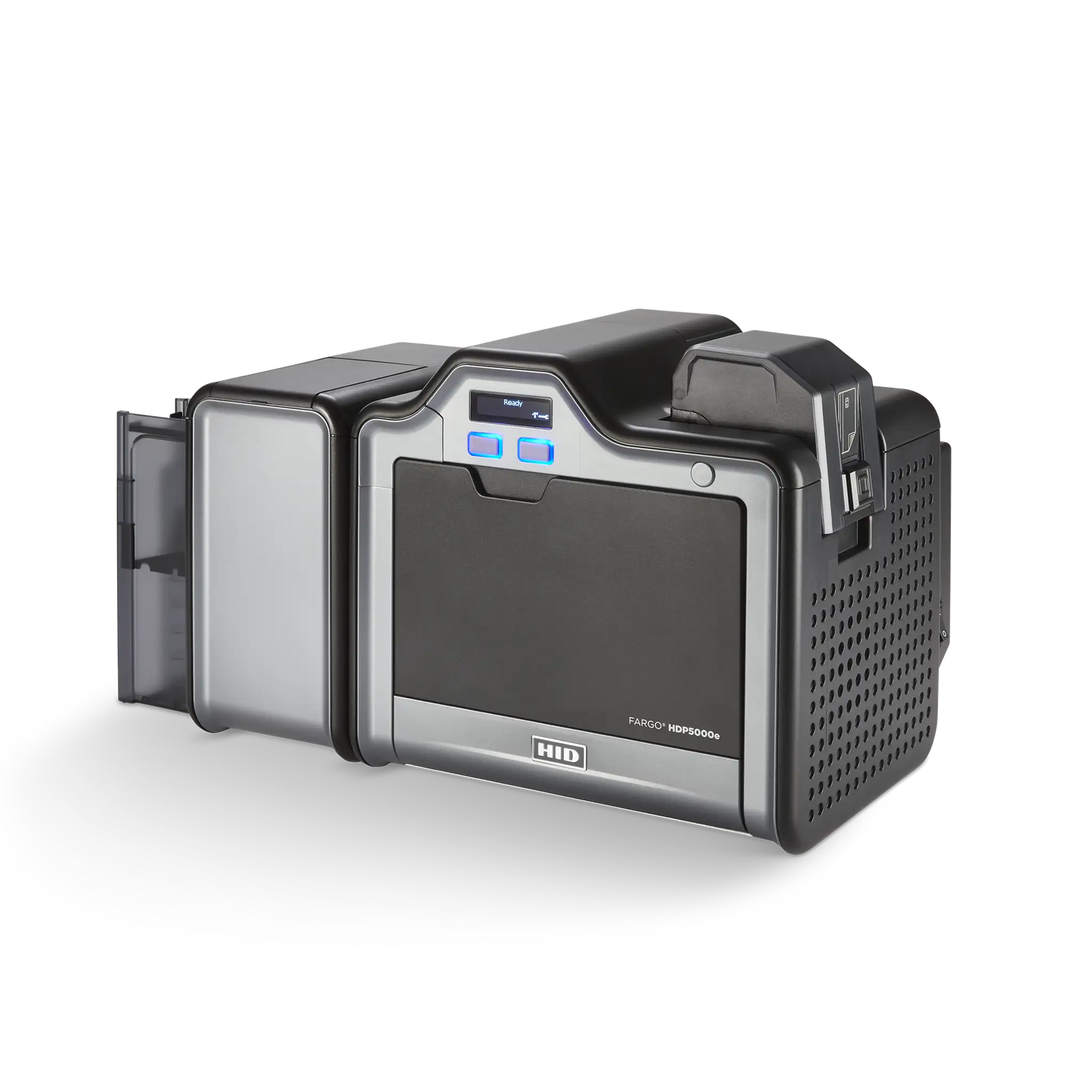 The HID® FARGO® HDP5000e is a high-performance ID card printer designed for organizations that demand professional, high-definition credentials. Powered by 7th-generation retransfer technology, this dual-sided printer produces vibrant, over-the-edge cards with sharp text and images on both sides. Its user-friendly design, featuring a SmartScreen™ interface, simplifies setup, operation, and maintenance.
