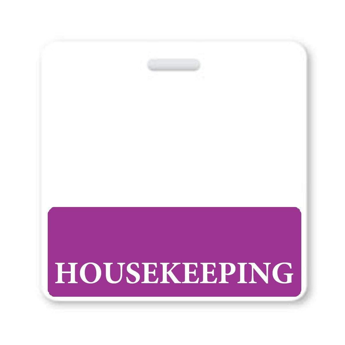 Now available with no custom setup fees or order minimums, we brought this item in by popular request. Just attach it to your standard badge clip with your existing slot punched ID badge and the "HOUSEKEEPING" text will show below your standard ID badge.The slot punch at the top allows you to loop both your slot punched ID card and HOUSEKEEPING badge buddy to the same holder, so no modification is required. If you use your ID in a badge holder, we have a two strap badge clip available that may work for you (P/N S2204).