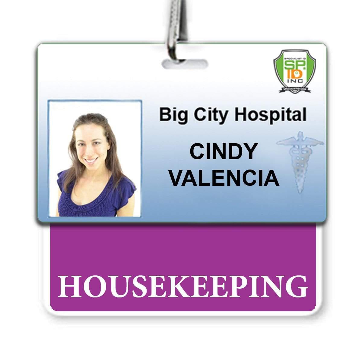 Our HOUSEKEEPING badge buddy with large text and solid purple border is a quick way to identify your housekeepers in any busy hospital, company or house setting. Our badge buddies are printed on both sides of the card so your text will be visible, even if the ID is flipped around.