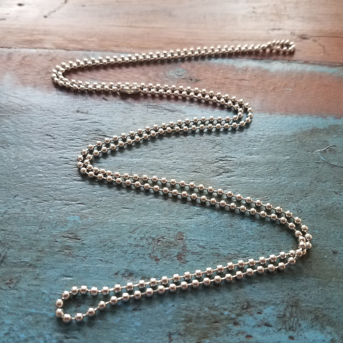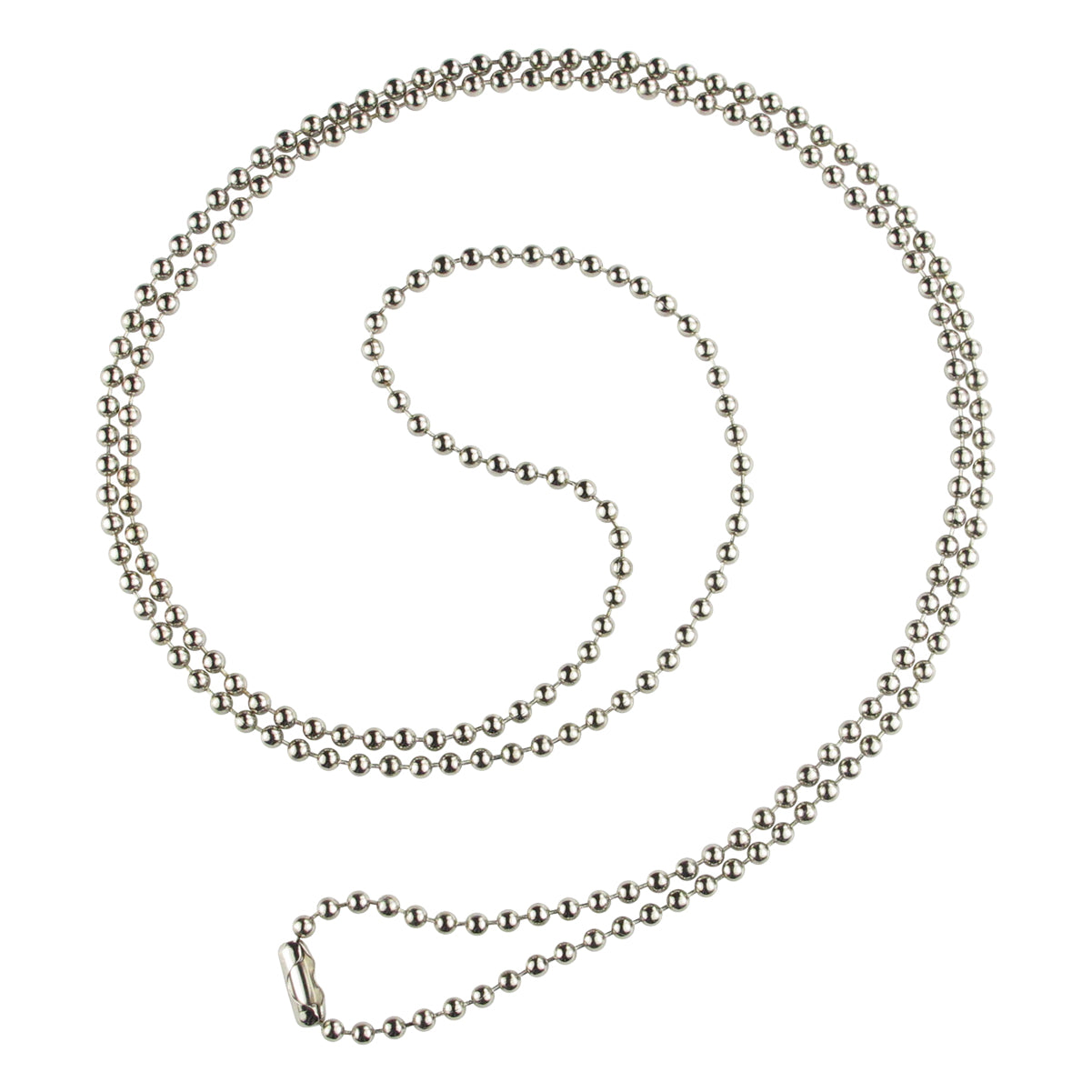 This nickel-plated steel beaded necklace chain is 30" (762mm) in length and has a connector. The bead size is No.3 (2.3mm), and it is a silver color. It has a strong and durable finish and is great for a variety of jewelry craft projects.