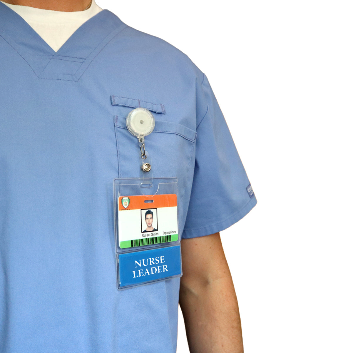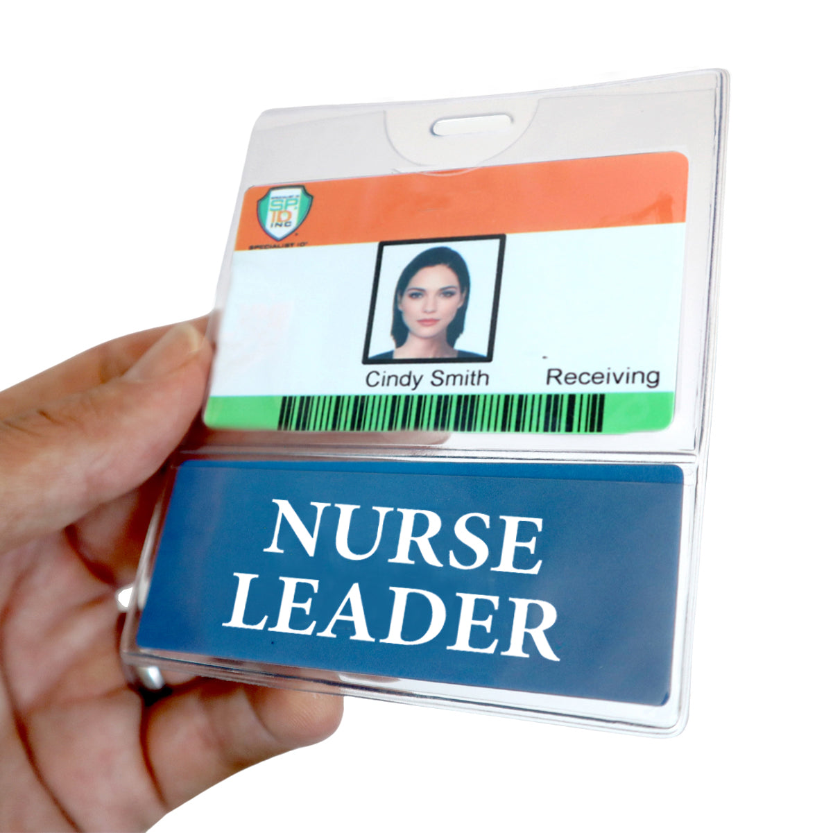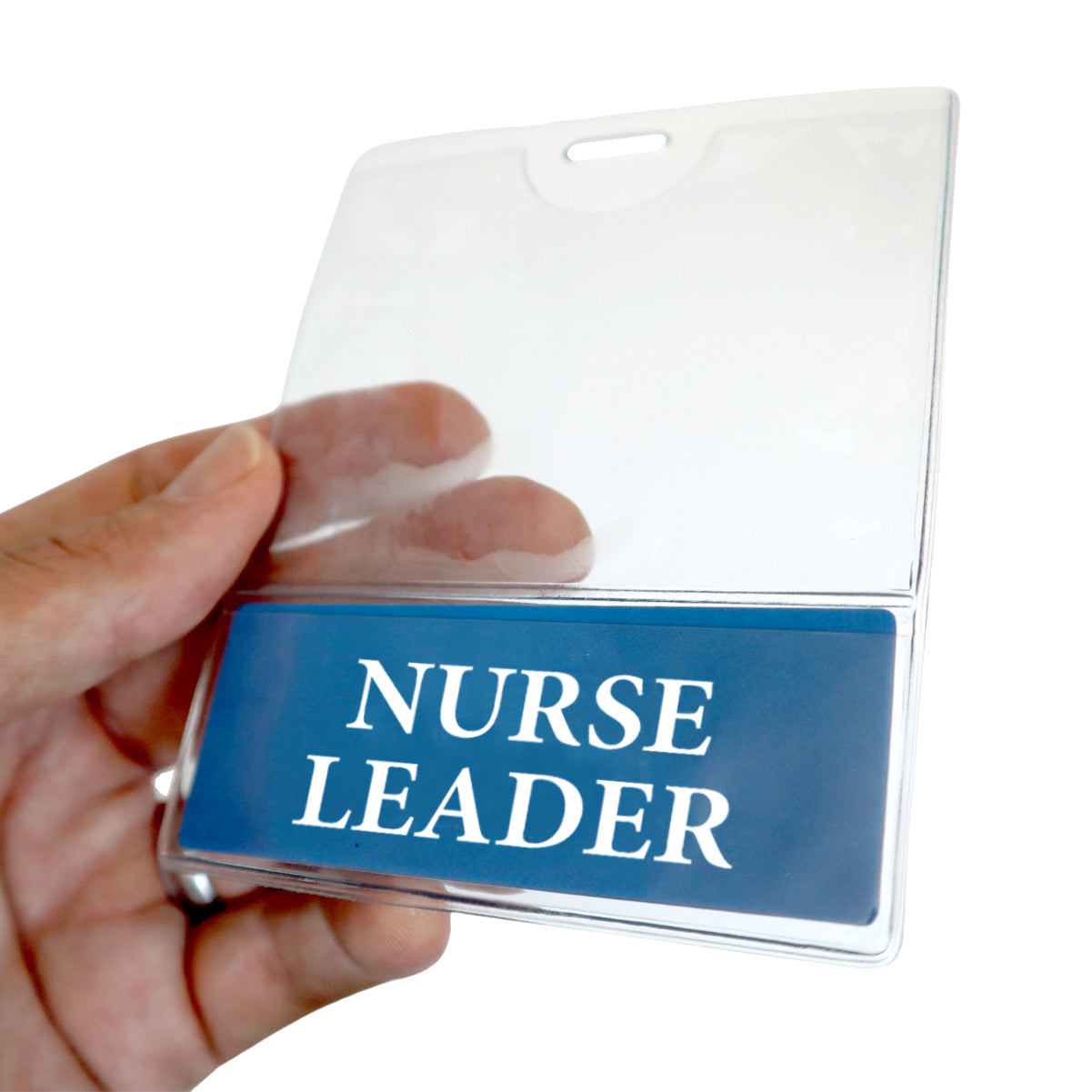 Nurse Leader BadgeBottoms® are badge holders with an extra pocket below to display titles that easily display your title right below your ID badge holder, therefore eliminating the need for a separate badge buddy. Ideal for people who use their badge inside a clear badge holder and do not punch a hole in their badge, or those who want to be able to see both the front and back of their ID badge easily, and also display their role/title.