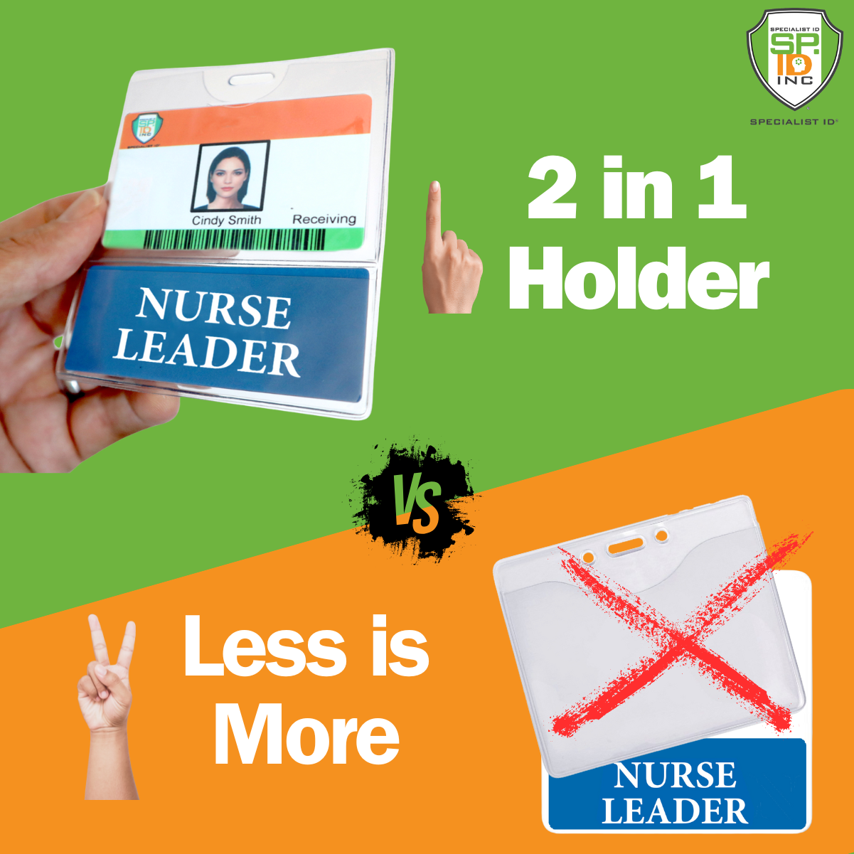 We use a durable composite material to print and laminate your medical work/office title that fits perfectly into the smaller compartmentalized pocket perforated in the bottom portion of the clear, vinyl sleeve. The above portion has an opening for your standard photo ID badge to be inserted from the top.