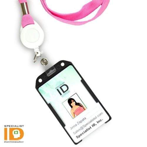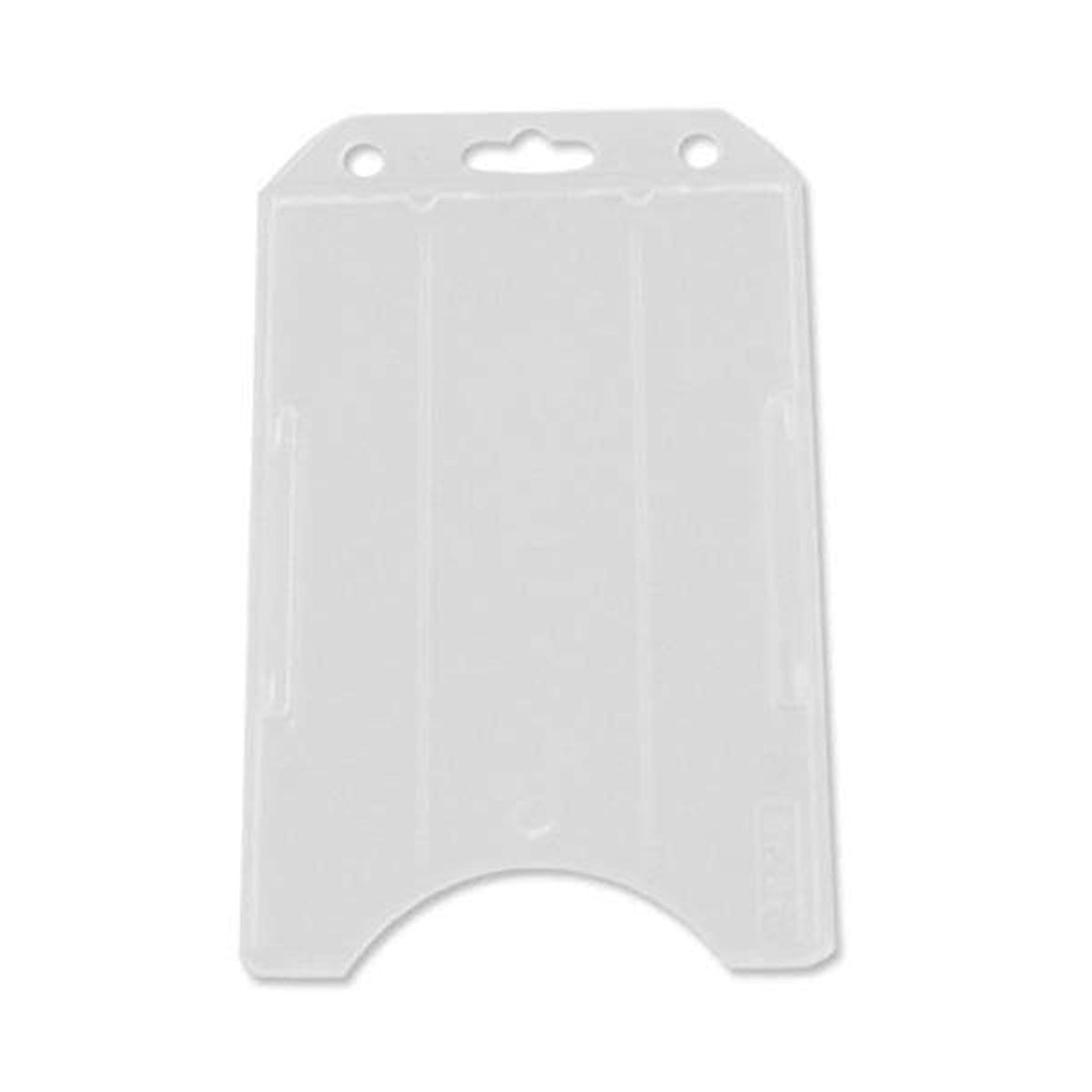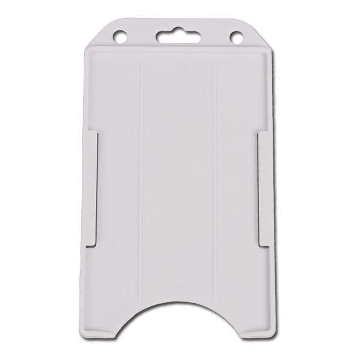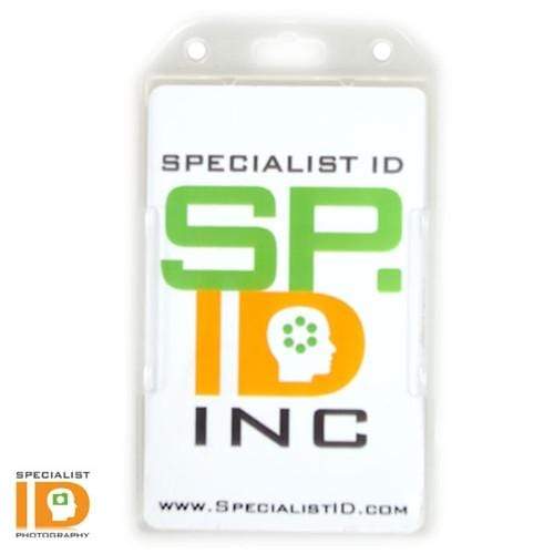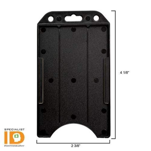 Our open-faced vertical plastic card holder, part number 1840-816X, is designed to for 1 standard (credit card sized) photo ID badge. Great for color coding and role recognition. Each department, team or clearance level can be recognized instantly. Simply slide your ID card through the front card holder, and the rails on all four sides will secure your credential in position.