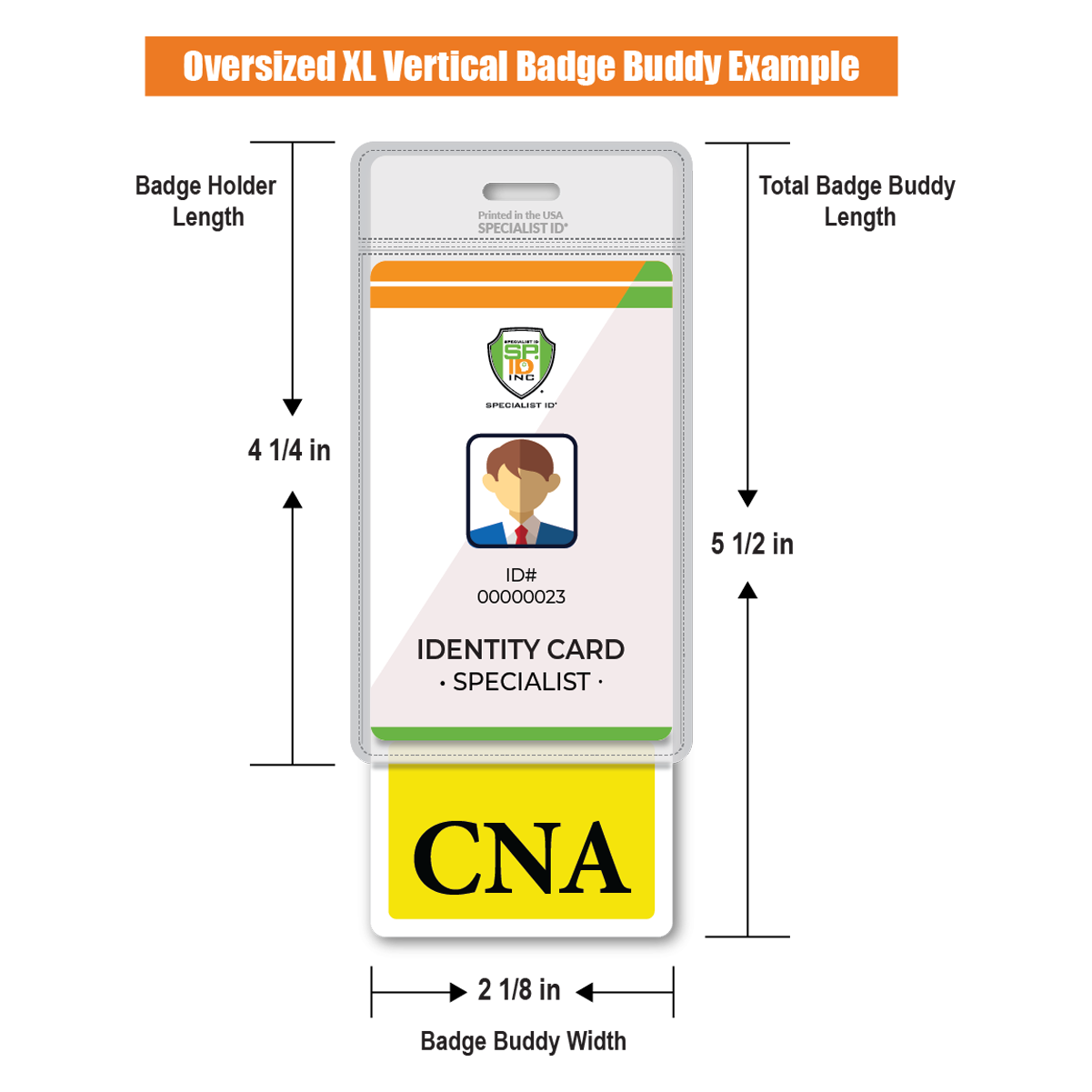 Our extended sized "CNA" vertical hospital ID badge buddy is 1" inch longer than our standard size badge buddies. Ideal to be worn beneath any standard (credit card sized) nurse ID badge that is worn inside a badge holder. Typically, for badges that do not have a slot punched hole.