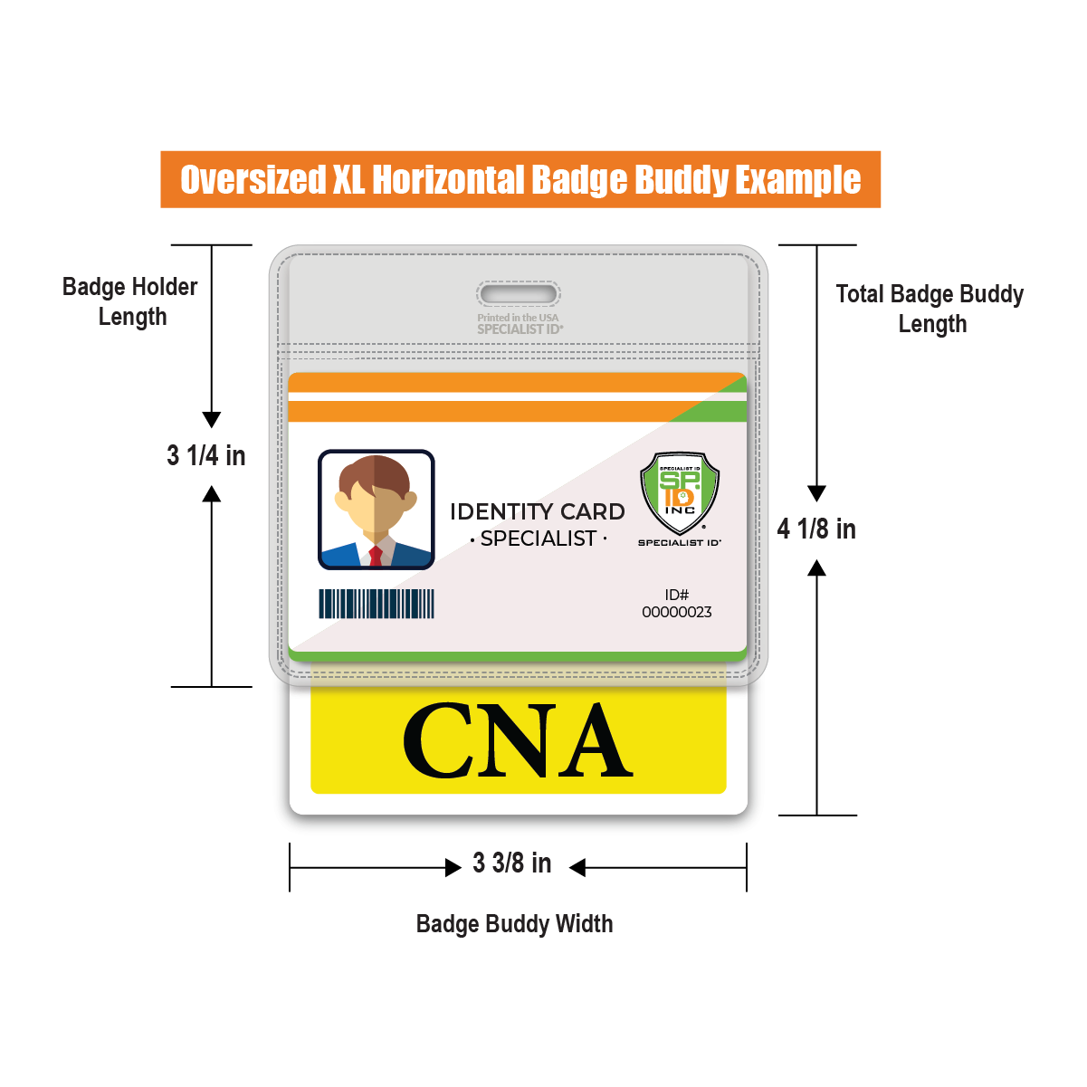 Our extended sized "CNA" horizontal hospital ID badge buddy is 1" inch longer than our standard size badge buddies. Ideal to be worn beneath any horizontal standard (credit card sized) Healthcare ID badge that is worn inside a badge holder. Typically, for badges that do not have a slot punched hole.