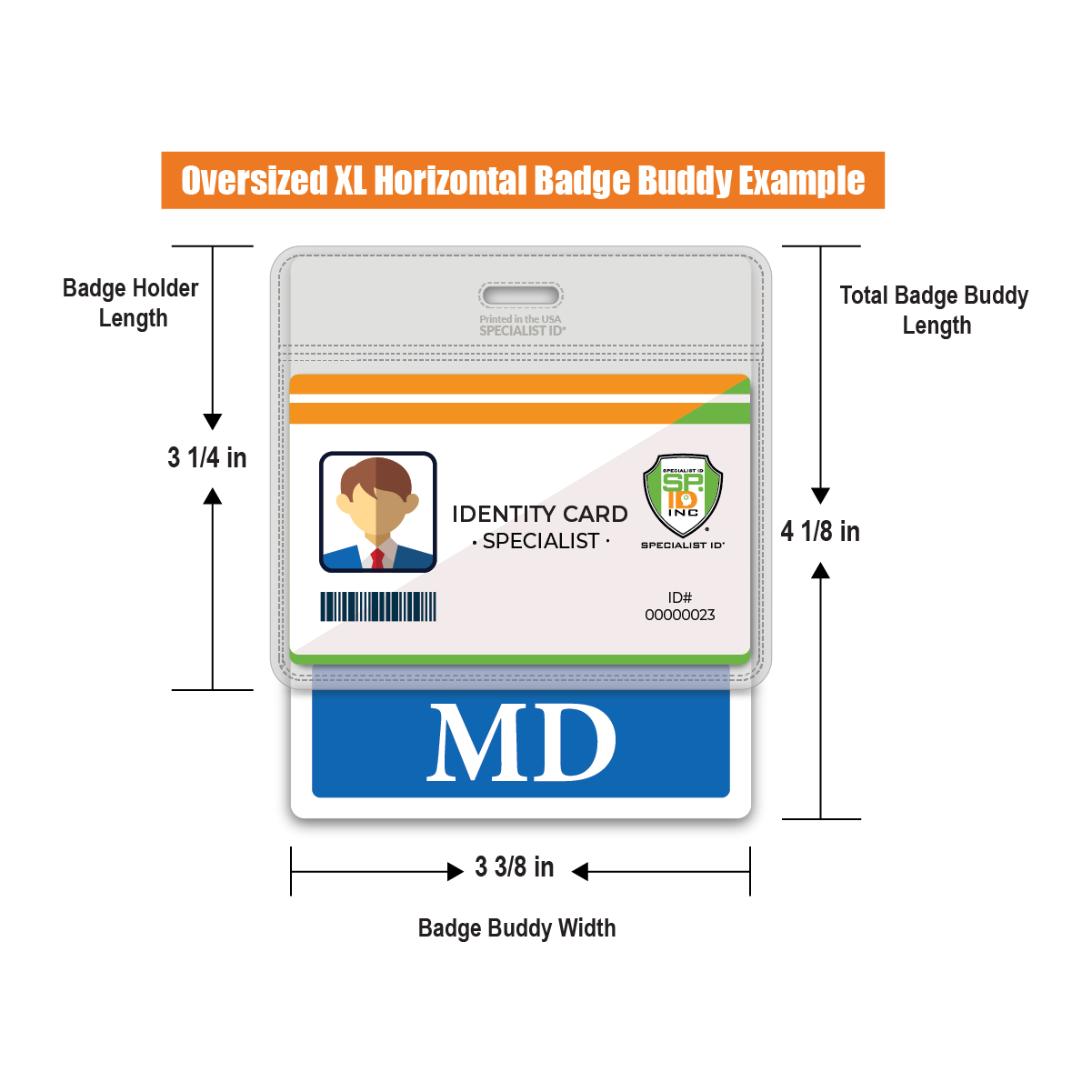Our extended sized "MD" hospital ID badge buddy is 1" inch longer than our standard size badge buddies. Ideal to be worn beneath any horizontal standard (credit card sized) healthcare ID badge that is worn inside a badge holder. Typically, for badges that do not have a slot punched hole.
