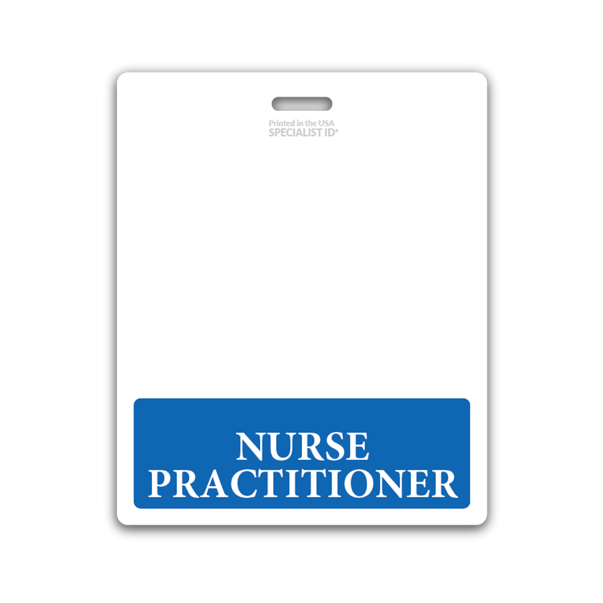 The Nurse Practitioner Badge Buddy is an essential tool specifically designed for Nurse Practitioners (NPs), who play a vital role in modern healthcare by providing high-level patient care combined with a touch of nursing compassion. This badge buddy aids in the immediate and clear identification of NPs to patients, families, and healthcare colleagues. It features the "Nurse Practitioner" title prominently on both sides, with a blue border, The design of the badge buddy takes into account the active and multifaceted role of NPs, offering flexibility to prevent breakage and an easy-to-clean surface to maintain the necessary hygiene standards in healthcare environments. It also includes a slot punch hole for easy and secure attachment to a badge reel or strap clip, ensuring that it can be comfortably worn behind a standard ID badge. This durable, laminated badge buddy not only provides immediate role recognition but also highlights the advanced clinical skills and educational achievements of Nurse Practitioners.