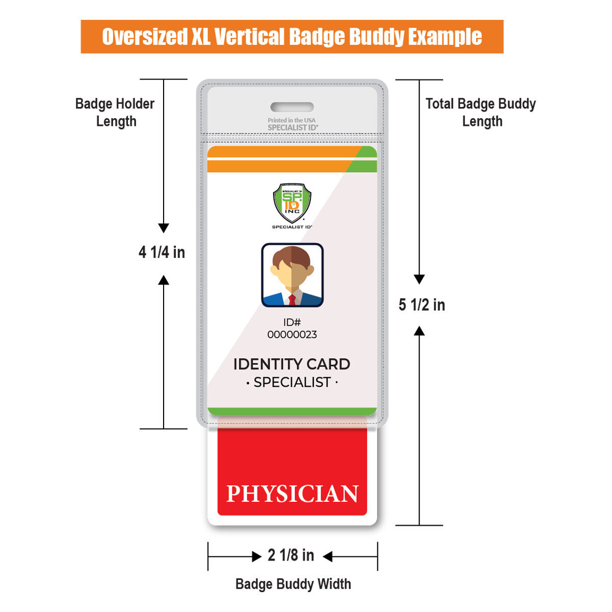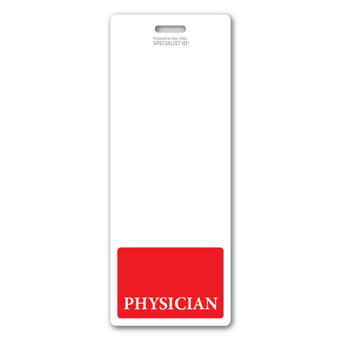 Our extended sized "PHYSICIAN" vertical hospital ID badge buddy is 1" inch longer than our standard size badge buddies. Ideal to be worn beneath any standard (credit card sized) nurse ID badge that is worn inside a badge holder. Typically, for badges that do not have a slot punched hole.