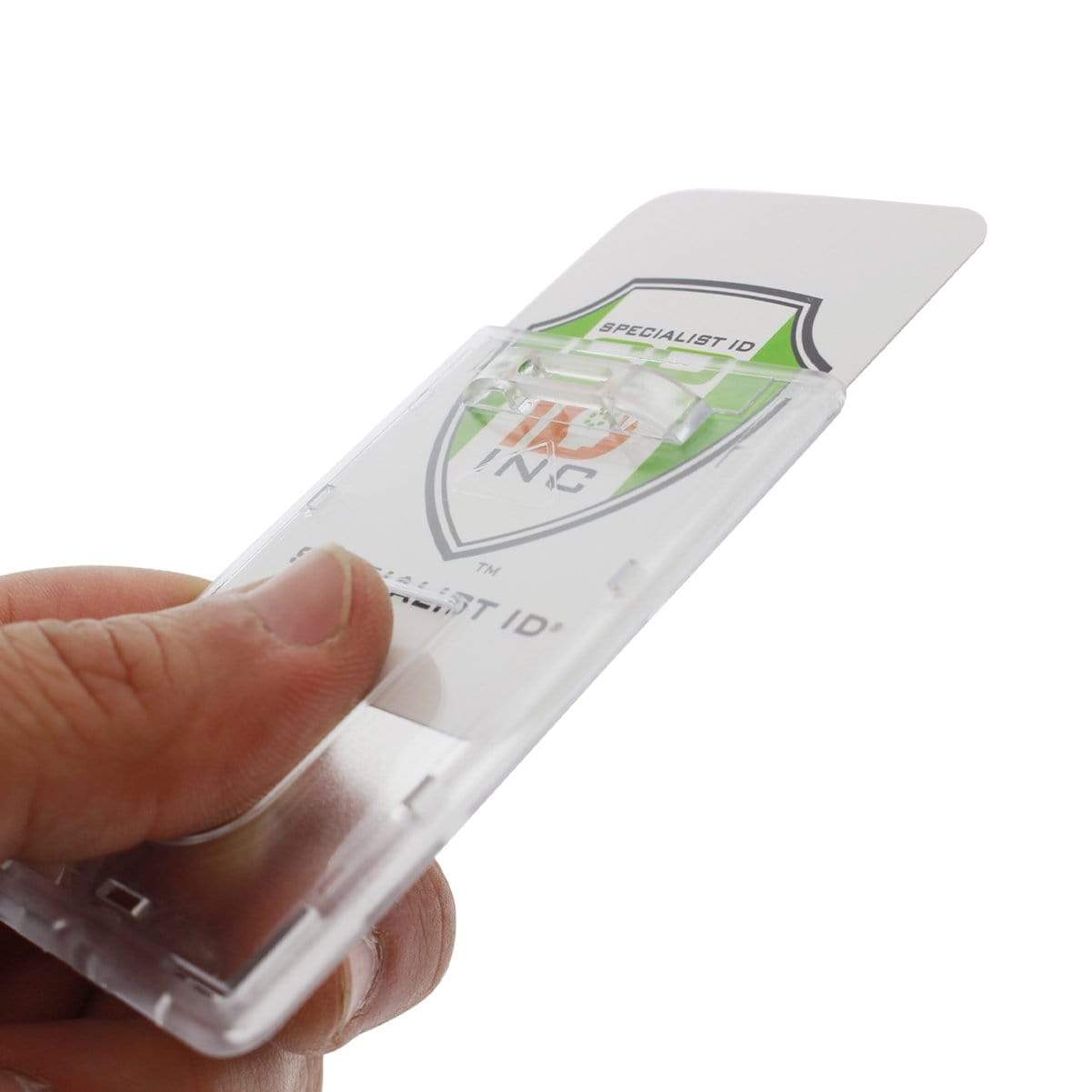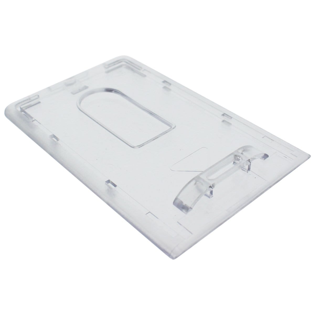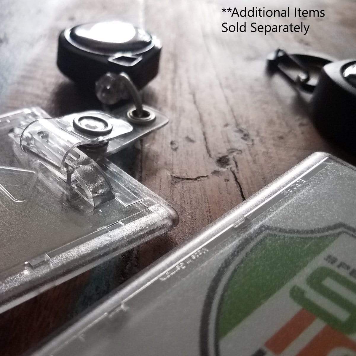 This rigid, protective badge holder will keep your credit card sized ID safe and protected for easy wear and use. Card loads in from the top and can easily be removed by sliding your card out using the thumb notch provided. Card remains in place otherwise. The rigid plastic ensures that it stays securely in place, minimizing the risk of loss or damage. . On the back side is a built-in holding slot which allows you to attach your favorite lanyard, badge reel, vinyl strap or neck chain.