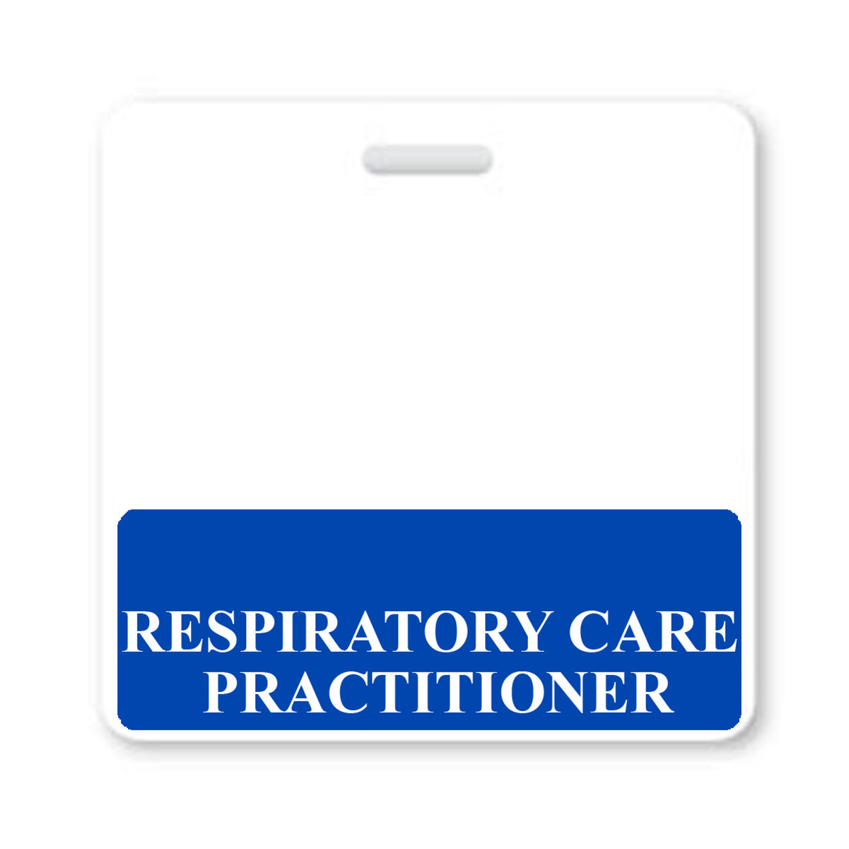 Now available with no custom setup fees or order minimums, we brought this item in by popular request. Just attach it to your standard badge clip with your existing slot punched ID badge and the "RESPIRATORY CARE PRACTITIONER" text will show below your standard hospital badge.