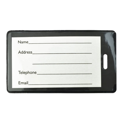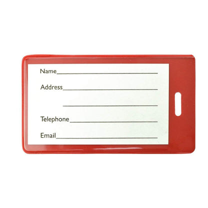 This semi-rigid vinyl luggage tag holder with loop, part number 1845-200X, helps you and others identify your baggage when traveling. You can either slide your business card through sleeve on the 4 1/4 X 2 1/2" semi-rigid vinyl case, or fill out your information on the included card.