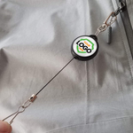 • A Custom Retractable Ski Pass Holder - Heavy Duty Sport Reel (2120-4101) - Add Your Logo attached to a zipper on a gray garment, featuring a custom logo on its round casing.