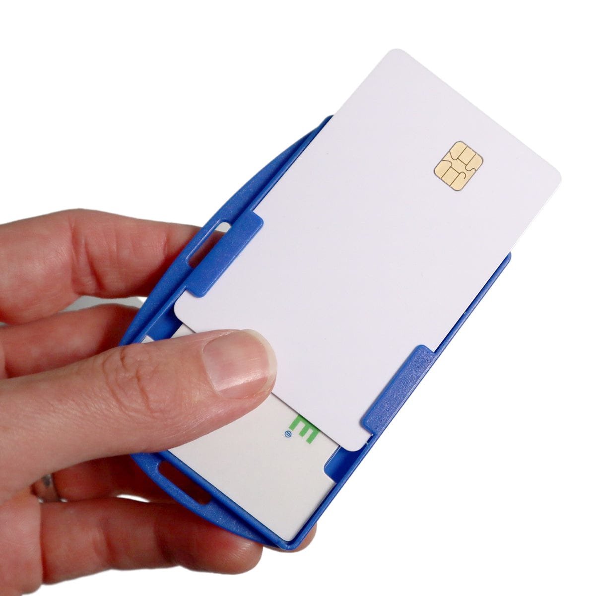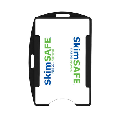 While the card is in the holder, the information on your card's chip cannot be read, because the SkimSAFE design shields your card, blocking any unwanted communication both to and from the card. When you are ready for your cards to be read, simply slide them out of the badge holder with your thumb.