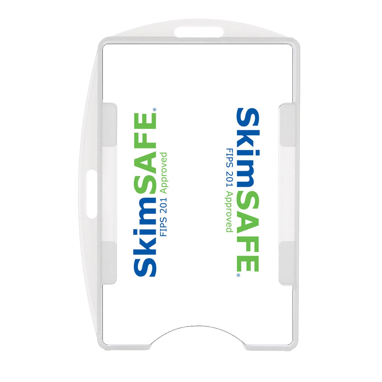 The SkimSAFE RFID blocking 2-Card ID Holder, part number AH-210, accommodates 2 standard credit card sized RFID cards (one on the front and one on the back). The front of each card will remain visible and you simply flip it over to display whichever side is needed. Made of a rigid plastic material which increases the lifespan of your credit card sized ID cards by keeping them from bending.