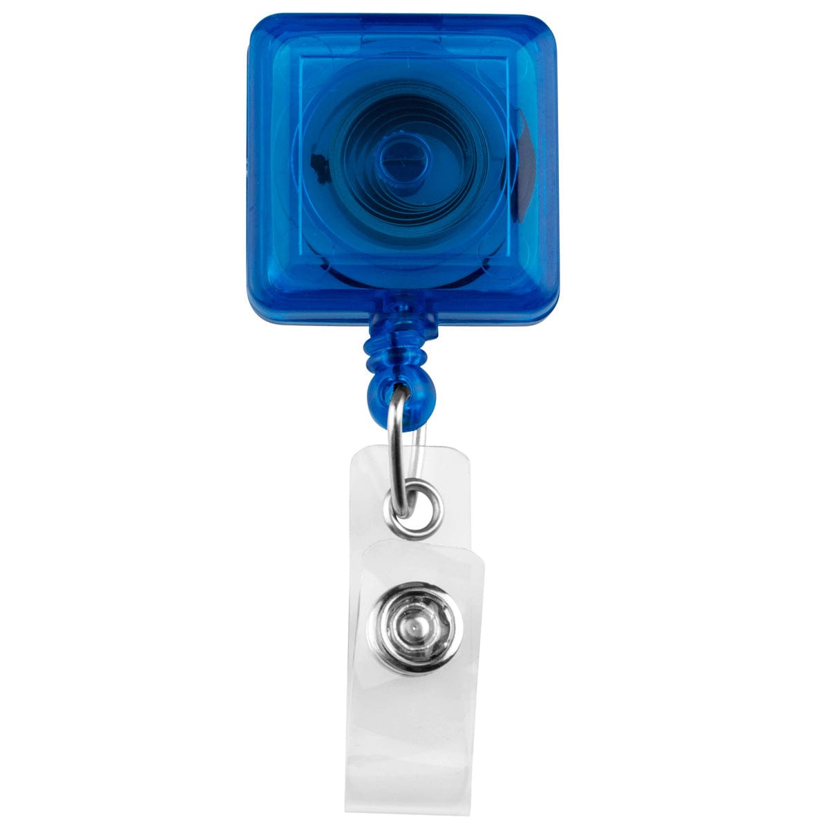 Translucent Blue Square Badge Reel, With Clear Vinyl Strap & Belt Clip. Reel Dimensions 1-1/4" X 1-1/4" (32Mm X 32Mm). Cord Length 34" (864Mm) - Rated For 100,000 Pulls.