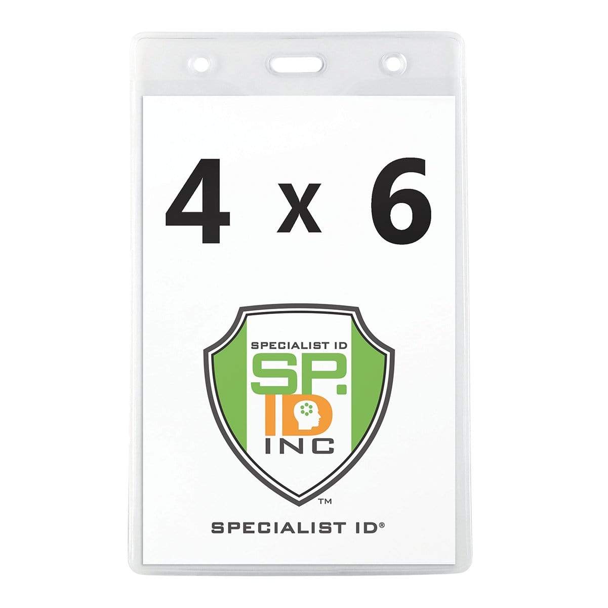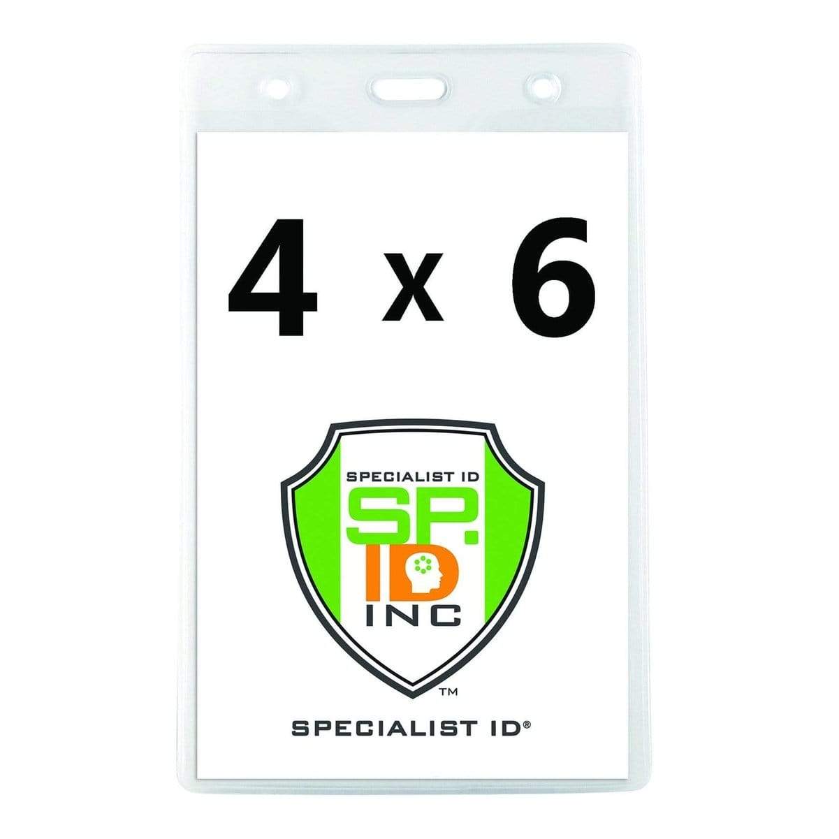 Our vertical 4 X 6 oversize vinyl badge holder with opaque back, part number 506-456, fits a 4" x 6" ticket, large event pass, government ID, or any other oversize credentials. Slide your badge through the slot and the front of your ID will be vertically displayed behind a clear vinyl, while the back of your ID card will be concealed by an opaque back.