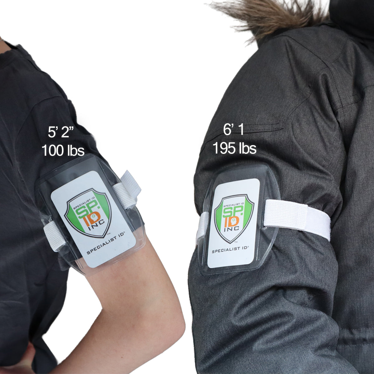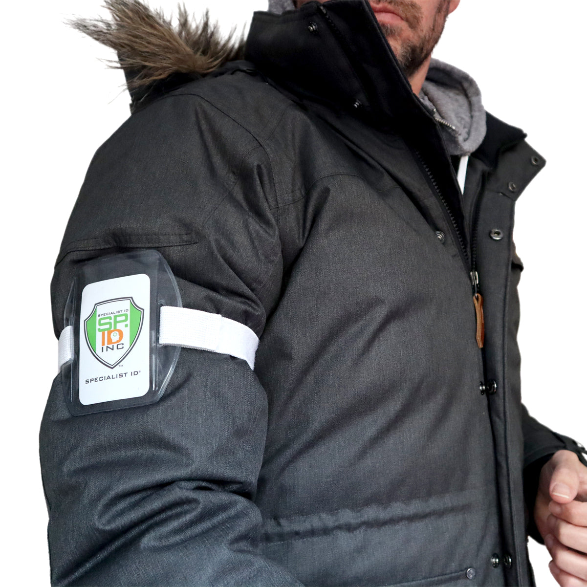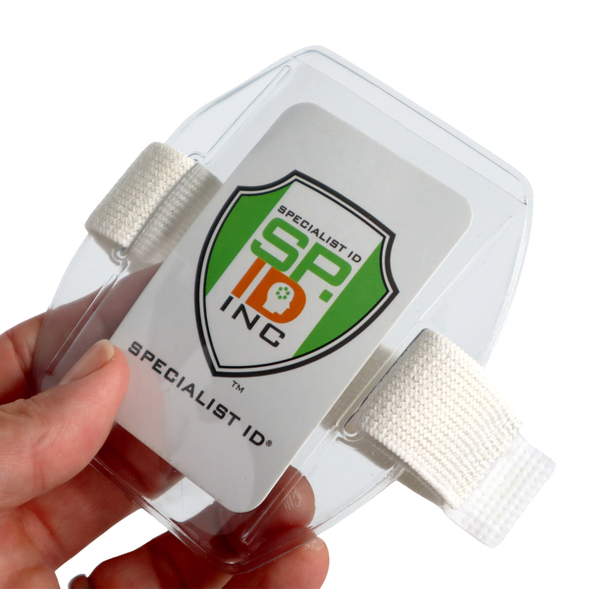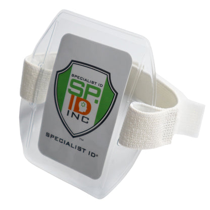 Our vertical arm band vinyl badge holder, part numbers 504-ARNB and 504-ARNW, will keep your photo ID card vertically displayed from your arm. The clear vinyl will display your ID badge vertically and legibly in a place that's easy for others to see. This arm band flexes with arm movement, and won't slip off your jackets or long sleeves either. The clear see through vinyl increase the lifespan of your ID by keeping it free of moisture, dust and other elements that degrade the lifespan of your ID badge.